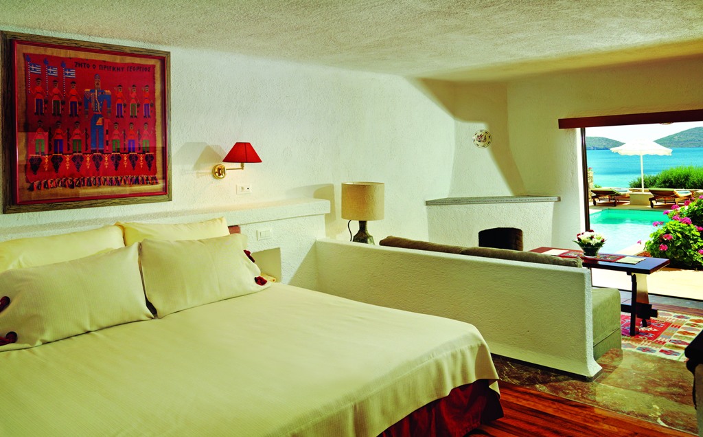 Knossos Royalty Suite with private pool: 110 м2. Бунгало расположено у самого моря. Состоит из 2 спальных комнат, гостиной, 2 ванных комнат, смежных со спальнями, с ванной в одной и ванной и паровым душем - в другой, 2 террас с бассейном на каждой.