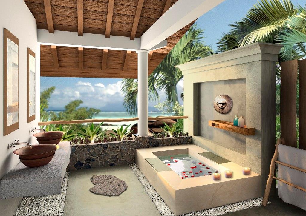 Ванная комната на открытом воздухе с соломенной крышей. Отдельная раздевалка. Терраса. Джакузи на открытом воздухе. <br>