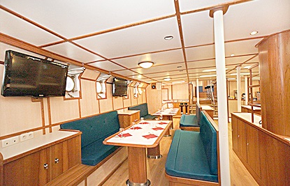 На паруснике может разместиться 33 пассажира в 16 каютах с удобствами. На борту также располагается просторный ресторан (завтрак, обед и ужин сервируются в формате «шведский стол»). Ресторан может использоваться как лекционный зал. Кроме того, на судне есть бар, который служит отличным местом для отдыха, общения или чтения.<br>
