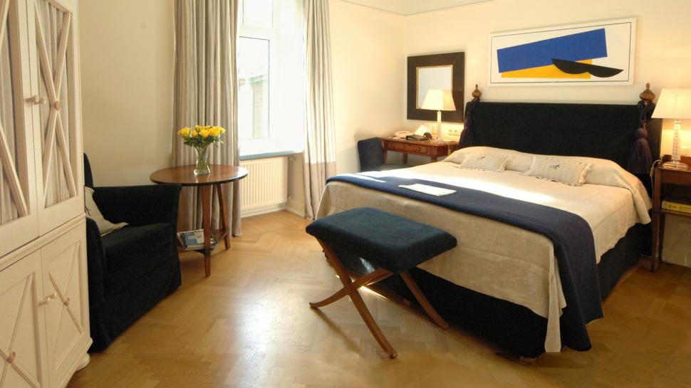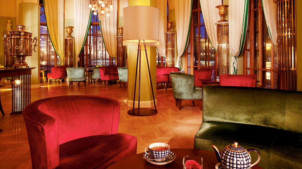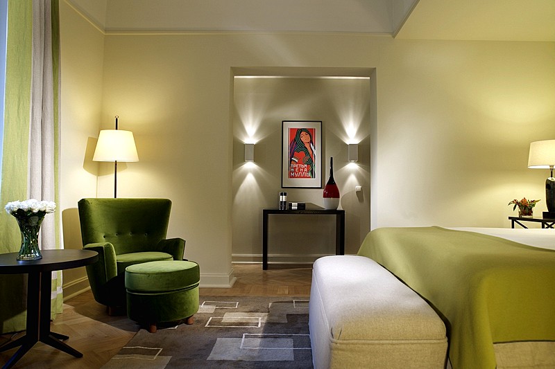 Junior Suite: от 45 м2, окна просторных апартаментов Junior Suite выходят на Большую Морскую улицу. Номера разделены на две зоны - спальню и гостиную с большим кофейным столиком, диваном и креслами. Апартаменты украшены выполненными на заказ коврами, предметами искусства и картинами русских мастеров. В просторных ванных комнатах, облицованных белым и черным итальянским мрамором, есть отдельная душевая кабина, ванна, подогреваемый пол и две раковины.
