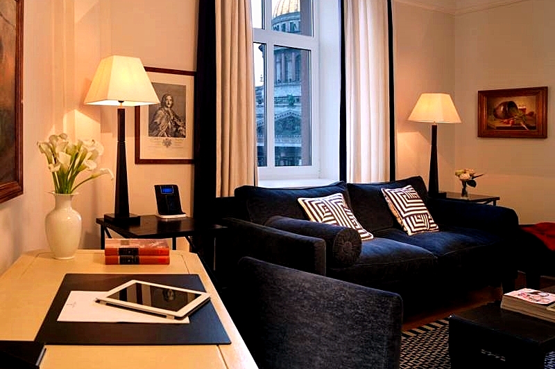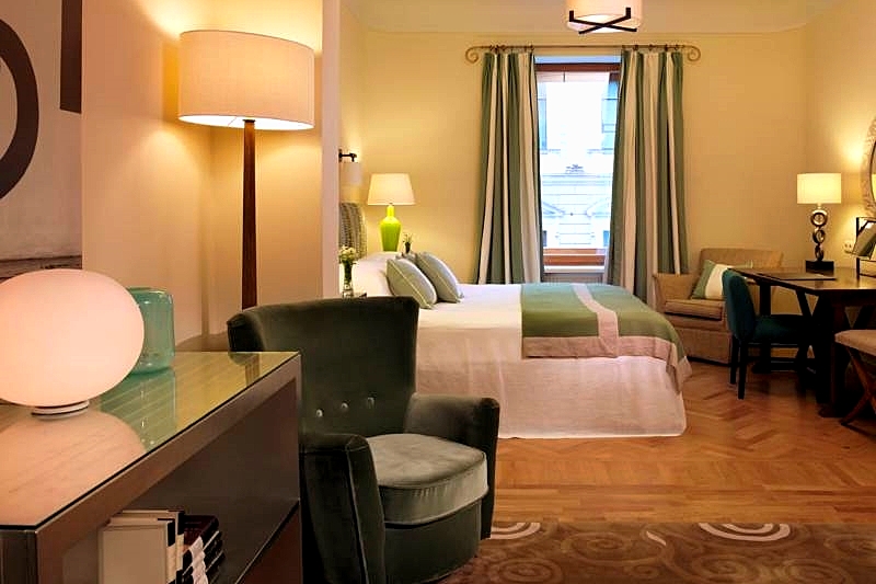 Deluxe Suite: от 60 м2, окна двухкомнатных апартаментов Deluxe Suite выходят на Большую Морскую улицу и Мариинский дворец. В номерах есть прихожая с вместительным шкафом для одежды, гостиная и спальня. В спальне установлена кровать king-size, которая по запросу может быть трансформирована в две отдельные кровати. Ванная комната отделана белым итальянским мрамором. Здесь есть отдельная душевая кабина для двоих, ванна и полы с подогревом.
