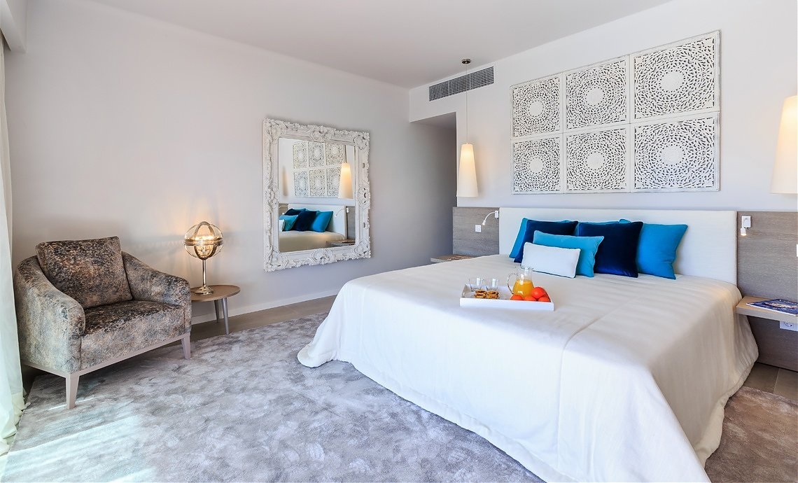 Junior suite 55м2 - 2взрослых+1ребенок до 12 лет / 3 взрослых с дополнительной кроватью. Спальня, гостиная зона с диваном. С террасы открывается вид на сад, бассейн или океан.