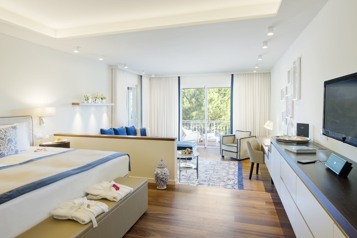 Junior Suite 42м2 - 2-3 чел.; кровать king-size или 2 одинарные, большая зона отдыха с раздвижным диваном, меблированная терраса, кофе-машина.