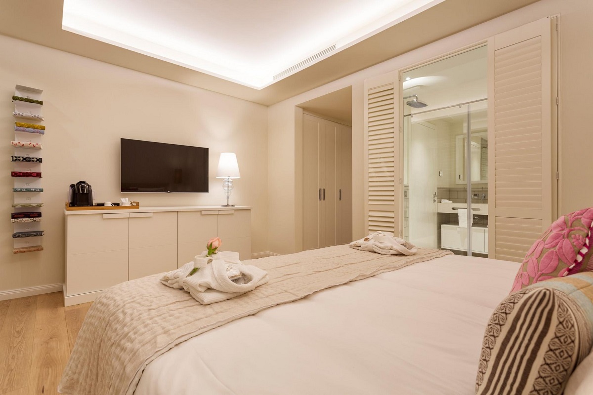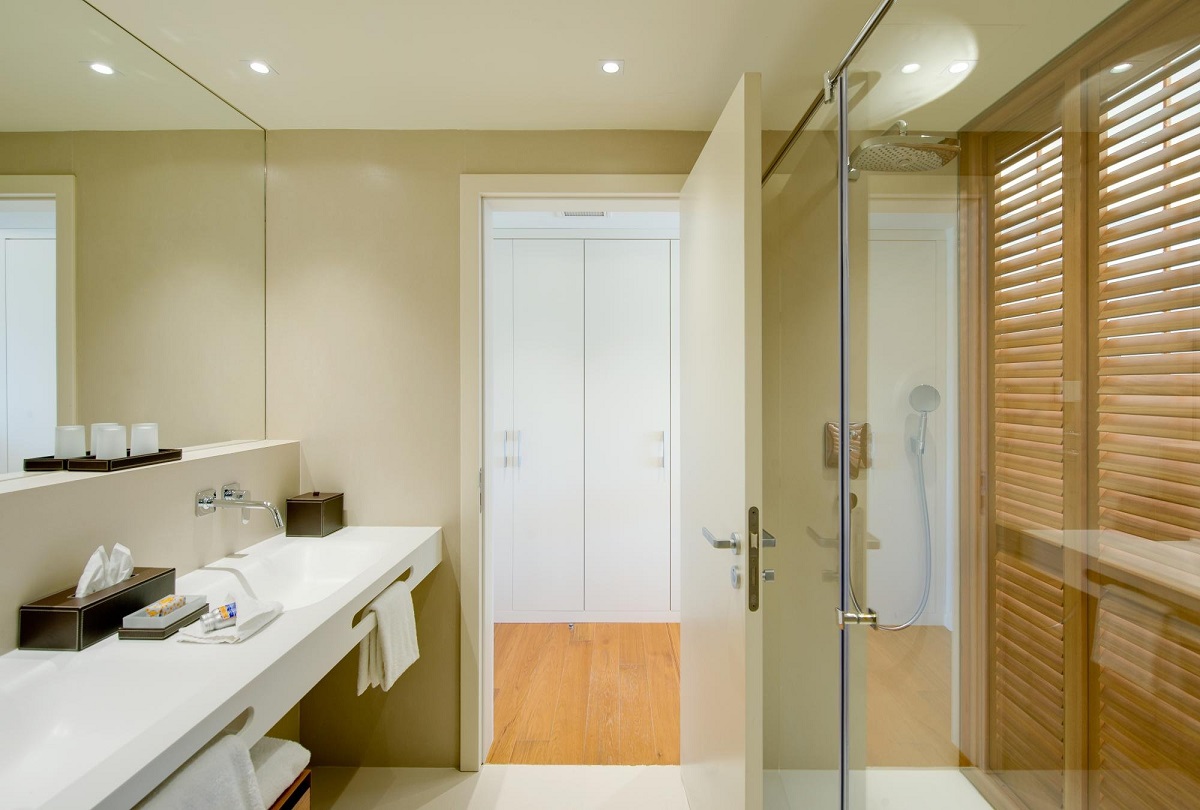 Residence Grand suite 65м2 - для 2 взрослых постояльцев; спальня, большая ванна, гостиная, гостевой туалет. Терраса с травой вместо плитки, с видом на море.