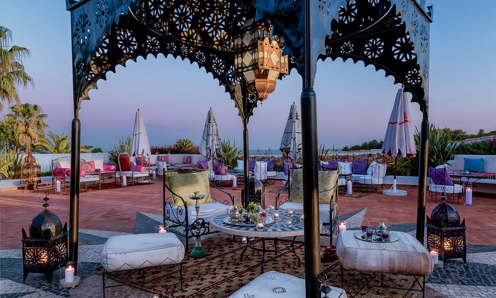 Manzar Terrace - бар на крыше в марокканском стиле с зонтами, кальяном, напитками, панорамным видом на океан.