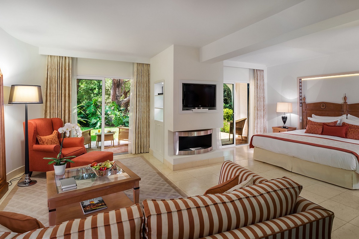 Oasis family suite 80м2 - просторная комната для семьи на первом этаже с видом на парк, есть выход на просторную террасу; совмещенная спальная и жилая зоны, двойная кровать, диван, камин, мебель на террасе, которая имеет выход в парк.