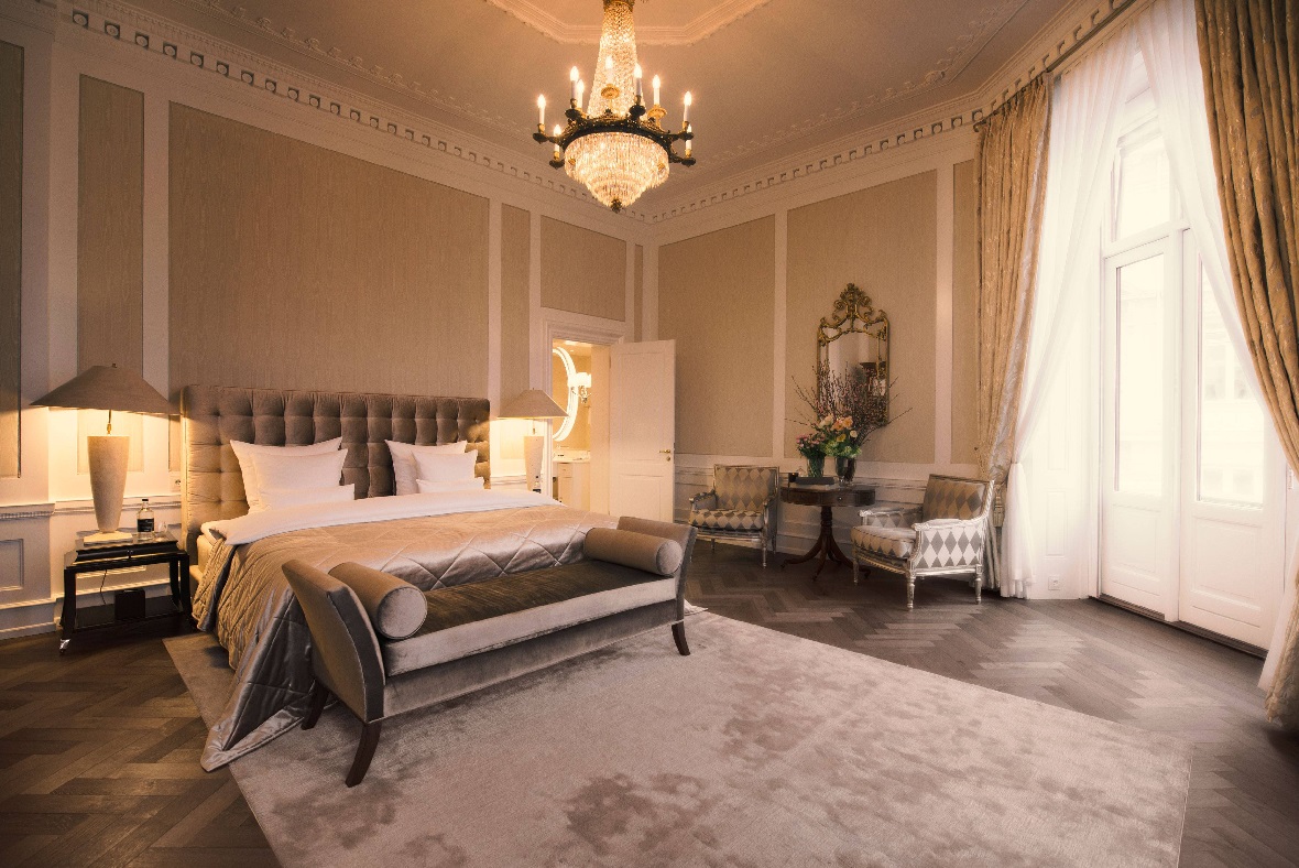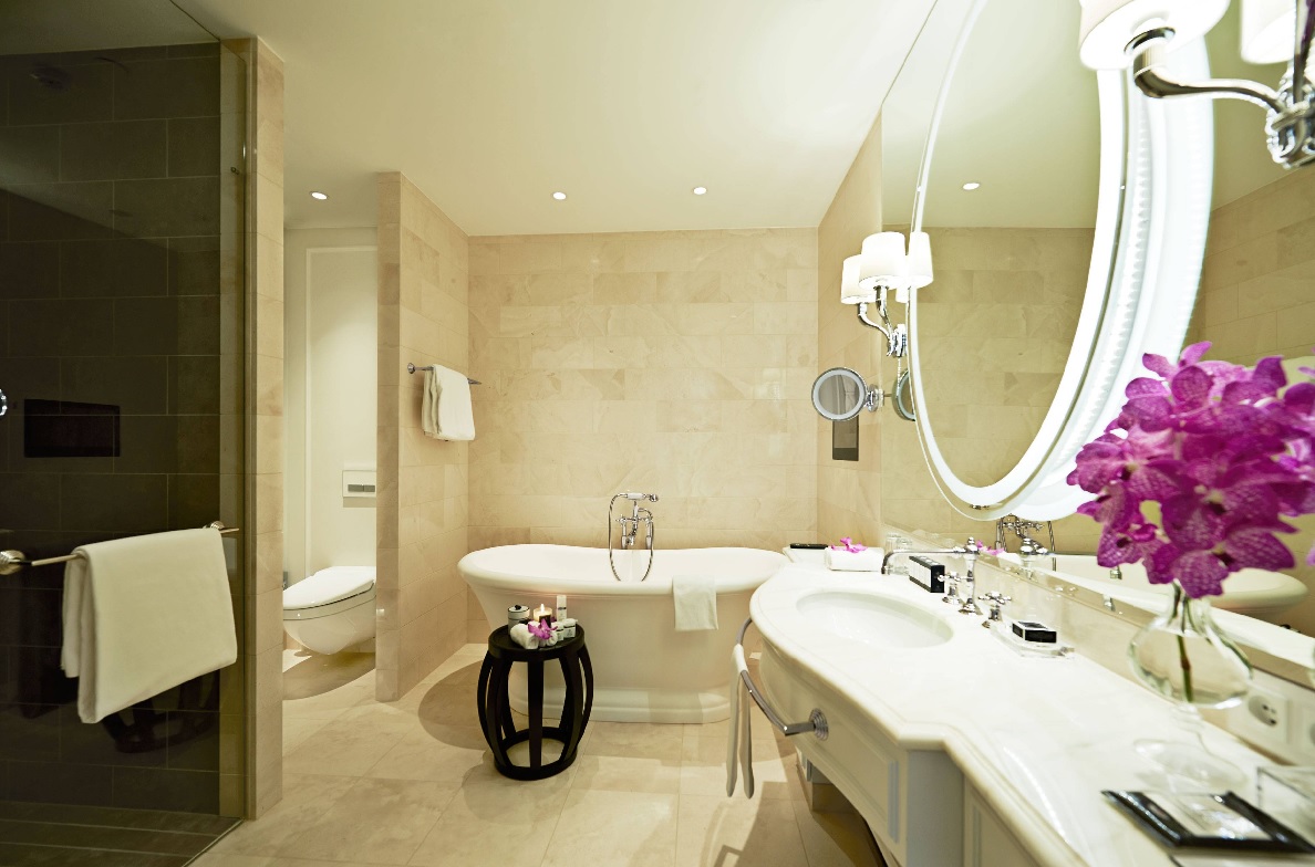 В номерах кровать king-size или 2 одинарные, система контроля температуры, телефон, телевизор, сейф, мини-бар с кофе-машиной Nespresso, WiFi, большая мраморная ванна, душевая кабина, тапочки и халат, фен.
