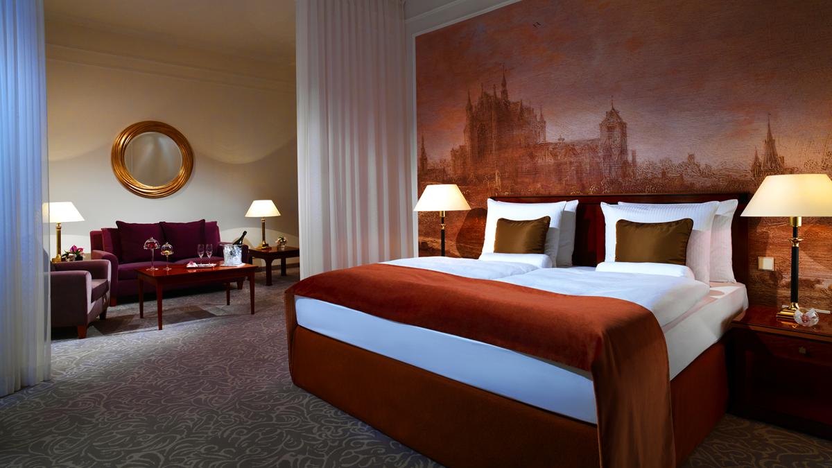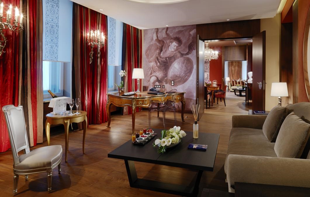 <b><span style="color: #7b3000;">Royal Ludwig Suite</span></b>: 190 м2. Роскошный номер с видом на Максимилианштрассе, украшен произведениями искусства, антикварной мебелью и эксклюзивной отделкой из натуральной кожи; включает просторную гостиную, гостиную с обеденной зоной, рабочую зону, 2 спальни с двуспальными кроватями, 2 ванные комнаты, гостевую туалетную комнату. Максимальное размещение - 4 взрослых + 2 ребенка.