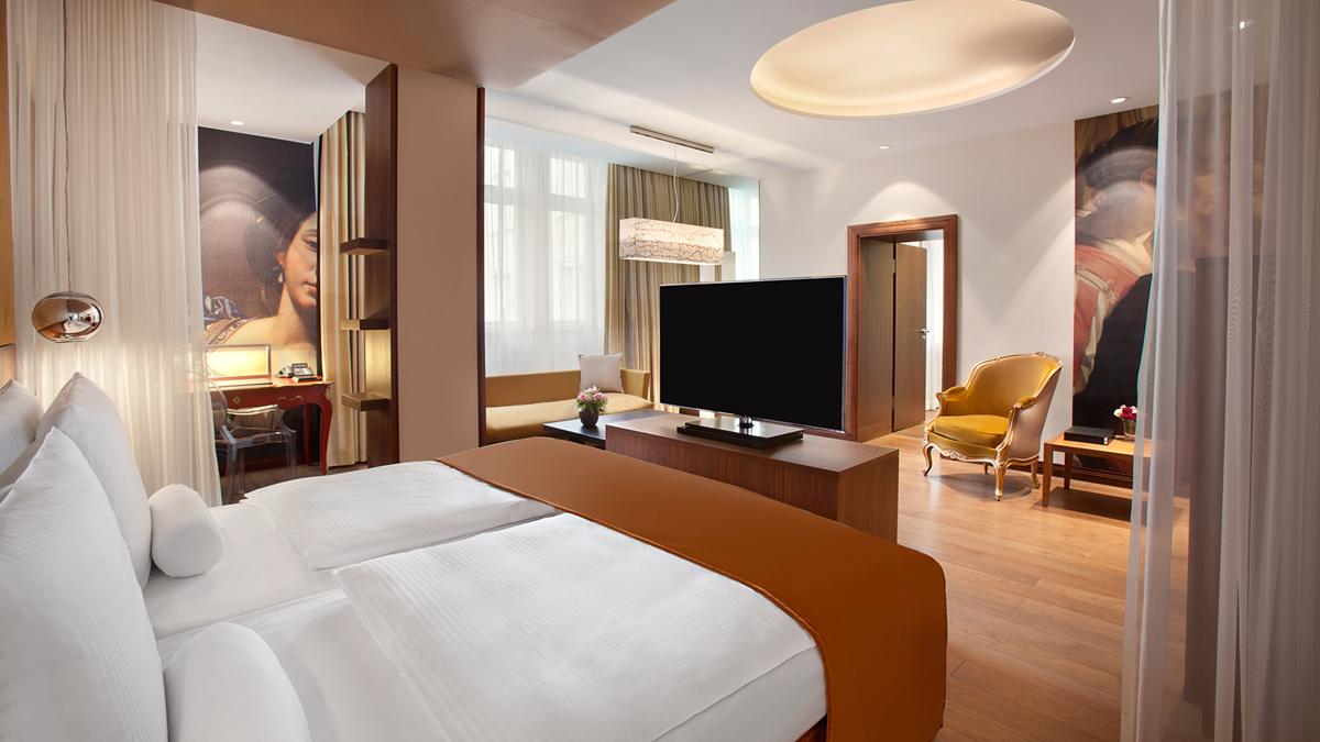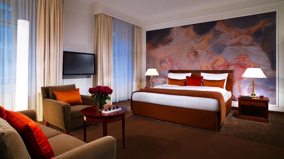<b><span style="color: #7b3000;">Deluxe Junior Suite</span></b>: 50 м2. Изысканный номер, украшенный настенной росписью в барочном стиле и антикварной мебелью, состоит из спальни, гостиной зоны, рабочей зоны, ванной комнаты с ванной и душем, вид на город или во внутренний двор. Максимальное размещение - 3 человека.<br>