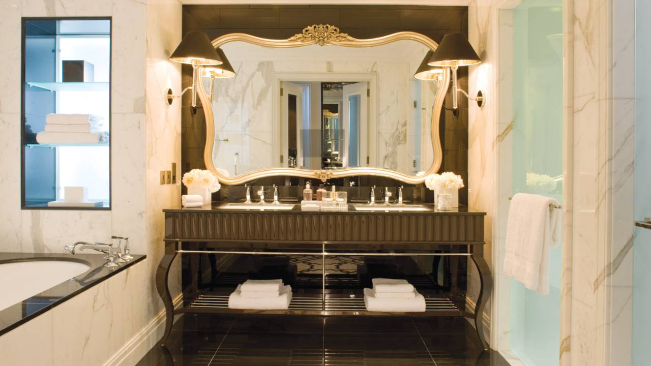 Ванные комнаты просторны, отделаны мрамором, есть двойная раковина, зеркало со встроенным телевизором, глубокая ванна, душевая кабина с ливневым душем и отдельный туалет с биде, для каждого гостя - мягкий махровый халат и тапочки.