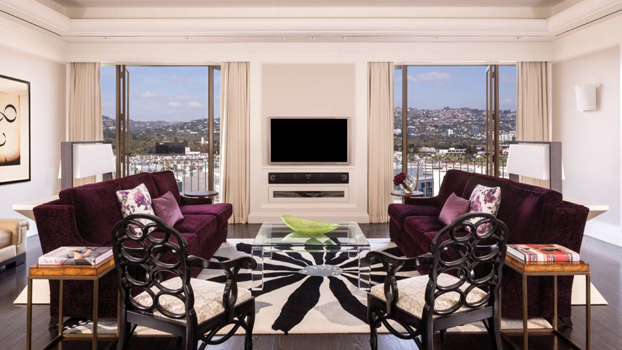 <span style="color: #7b3000;"><b>One-Bedroom Corner Beverly Suite</b></span>: 88 м2. Угловой номер, расположен с 7 по 12 этажи в крыле Beverly, состоит из гостиной, спальни с кроватью king-size, ванной комнаты, гостевой туалетной комнаты, 2 балконов с видом на Голливудские холмы и Беверли-Хиллз. <br>