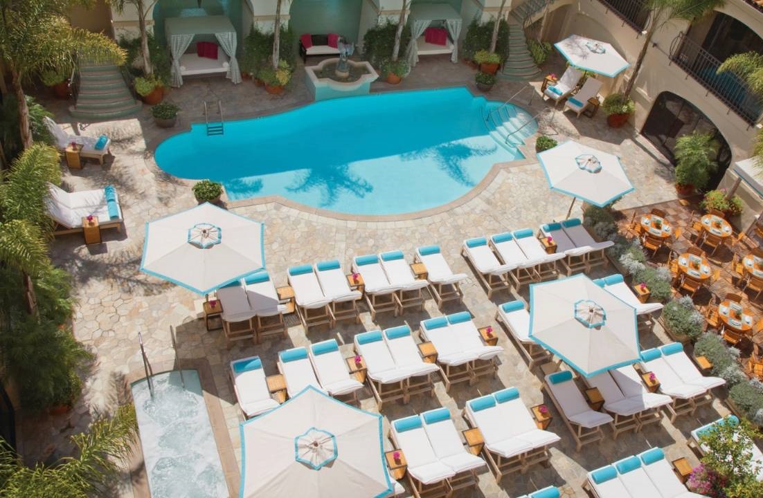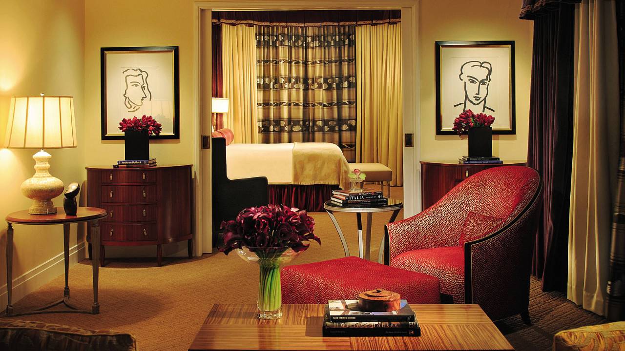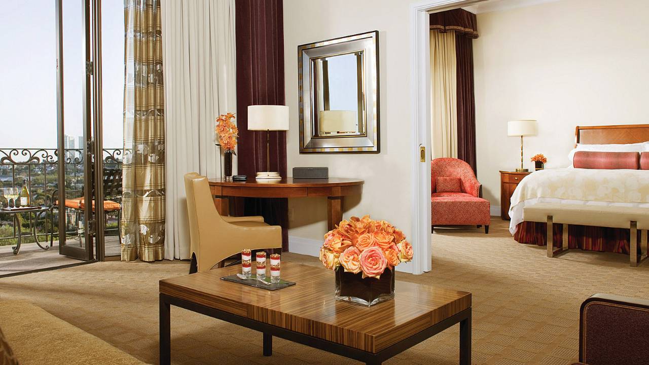 <span style="color: #7b3000;"><b>One-Bedroom Deluxe Beverly Suite</b></span>: 67 м2. Расположен с 2 по 10 этажи в крыле Beverly, состоит из гостиной, спальни с кроватью king-size, 2 ванных комнат, большого меблированного балкона с видом на Голливудские холмы, города, бассейн или на вход в отель. <br>
