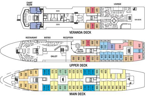 Каюты Single в Категории 2 выделены синим цветом – это каюты № 309-312 и 310-33. Каюты Single в Категории 3 выделены розовым цветом – это каюты № 105, 106, 203 и 208. </span><br>