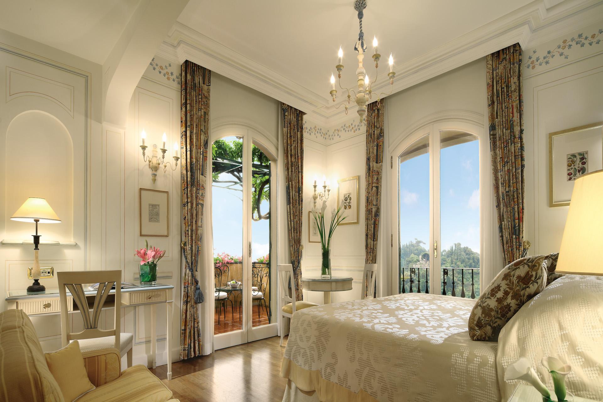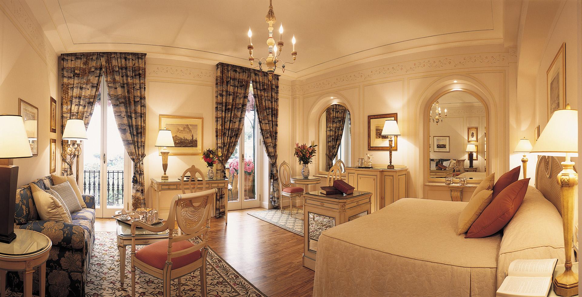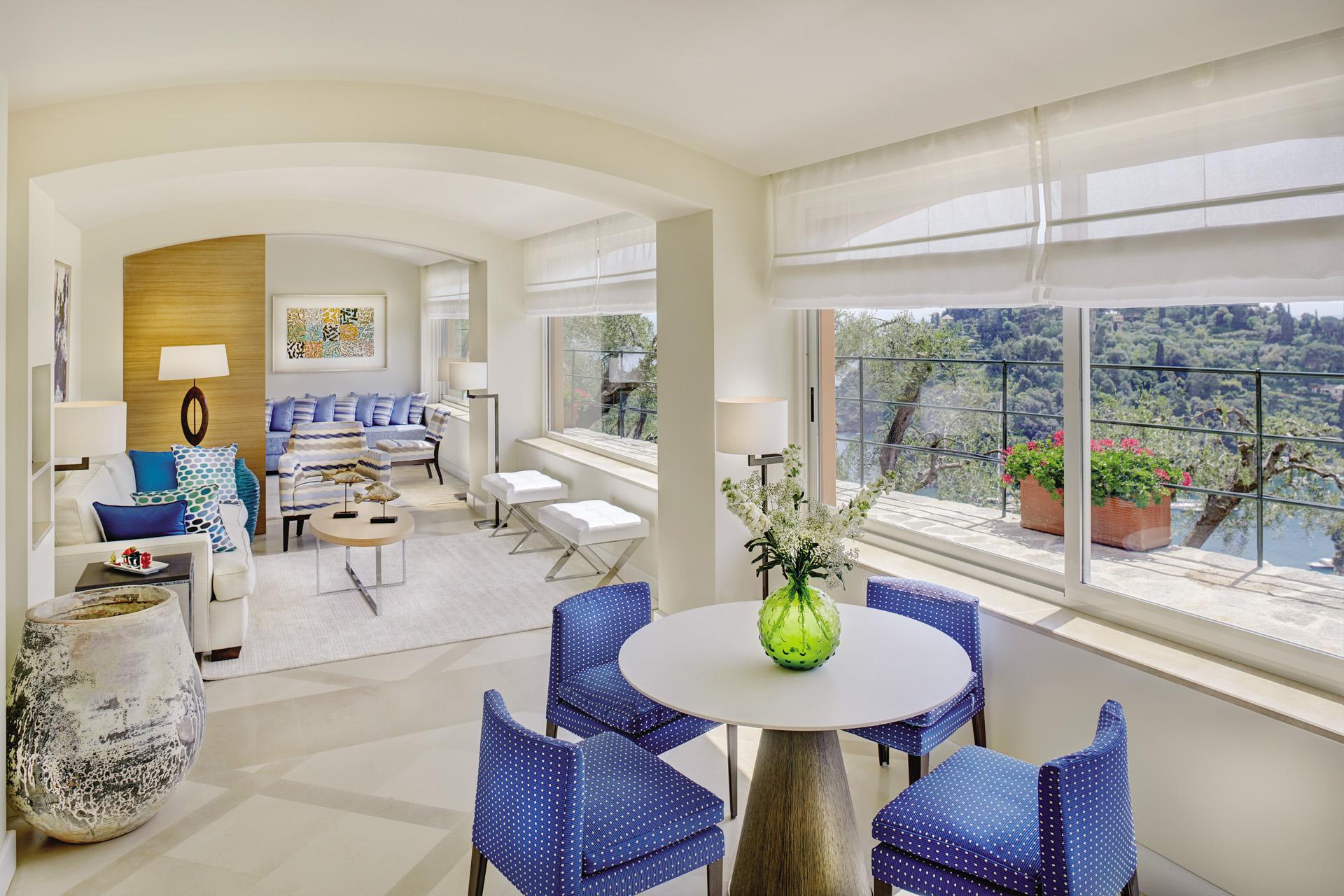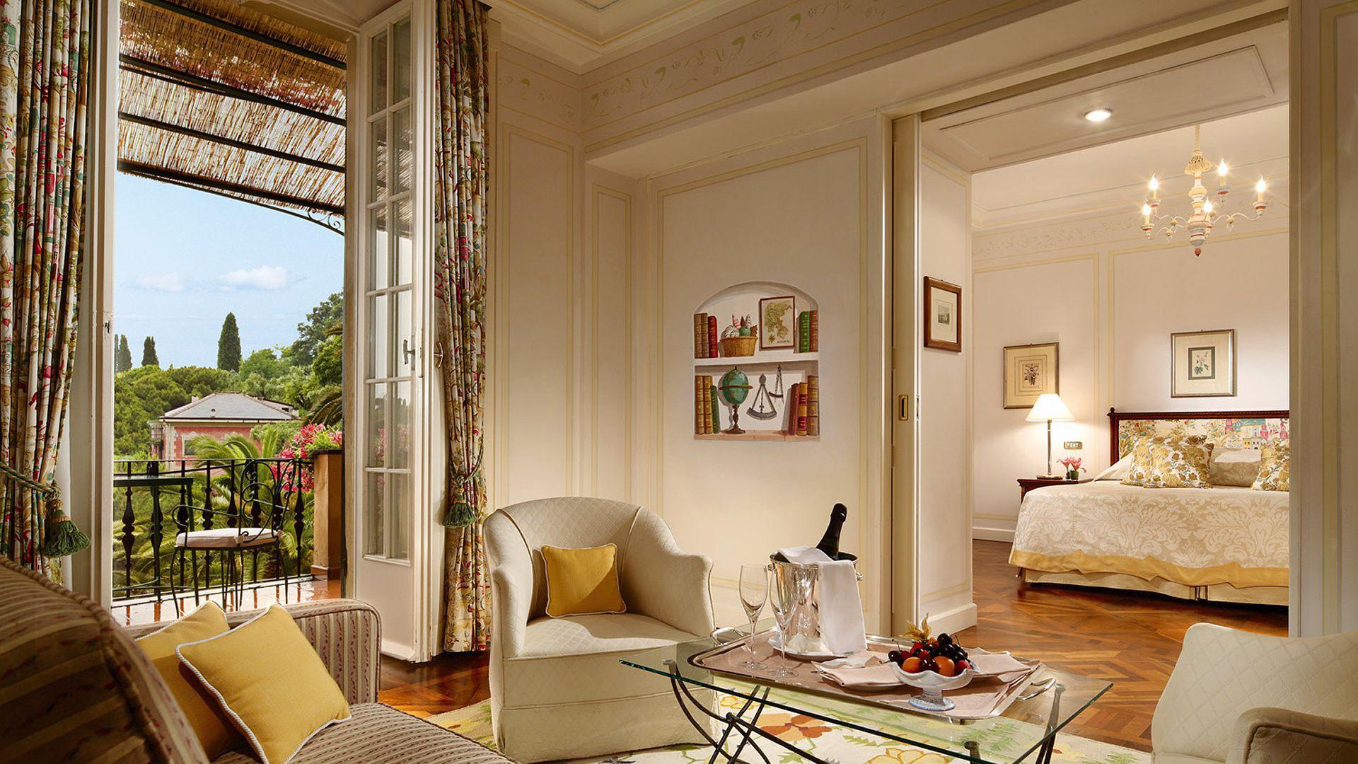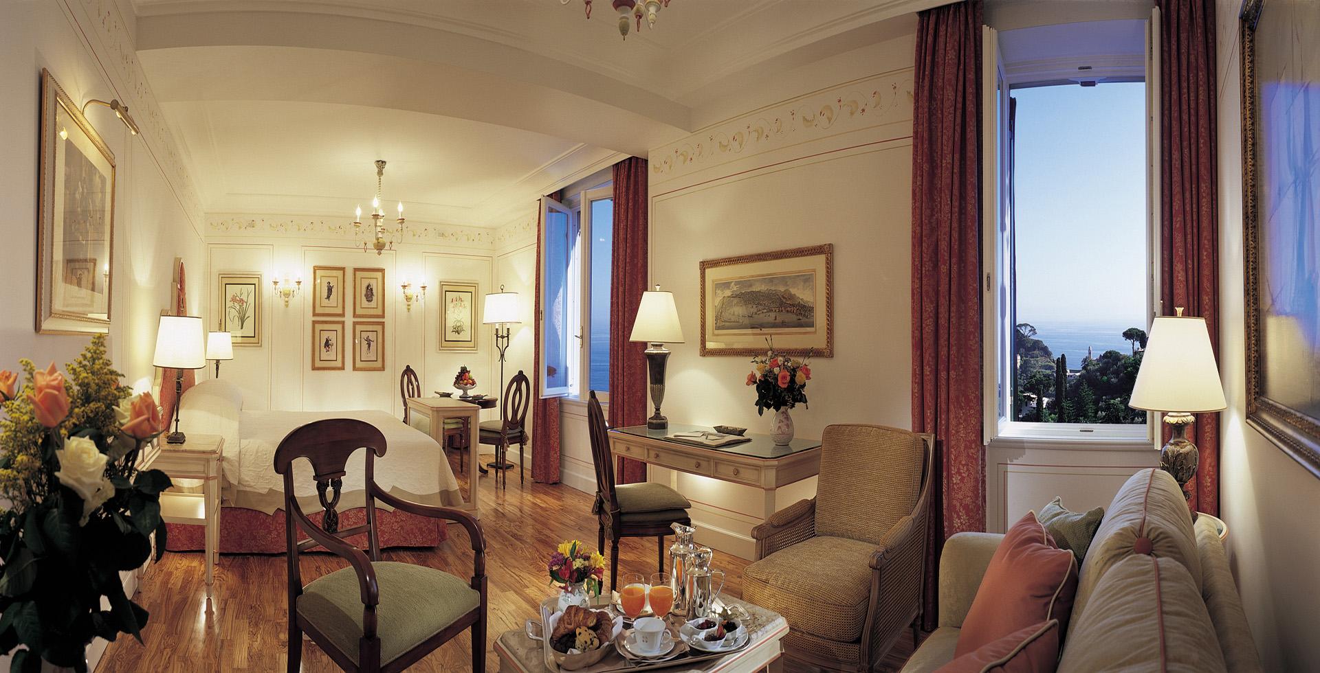 <b><span style="color: #7b3000;">Presidential Suite: </span></b>50 м2. Роскошный номер, состоит из спальни с кроватью king-size, украшенной живописью «тромплей», гостиной, шикарной мраморной ванной комнаты с круглой ванной, отдельным душем и двухсекционной раковиной, четырех террас с великолепным панорамным видом на бухту Портофино и залив Тигуллио. Возможно соединение с Executive Junior Suite.