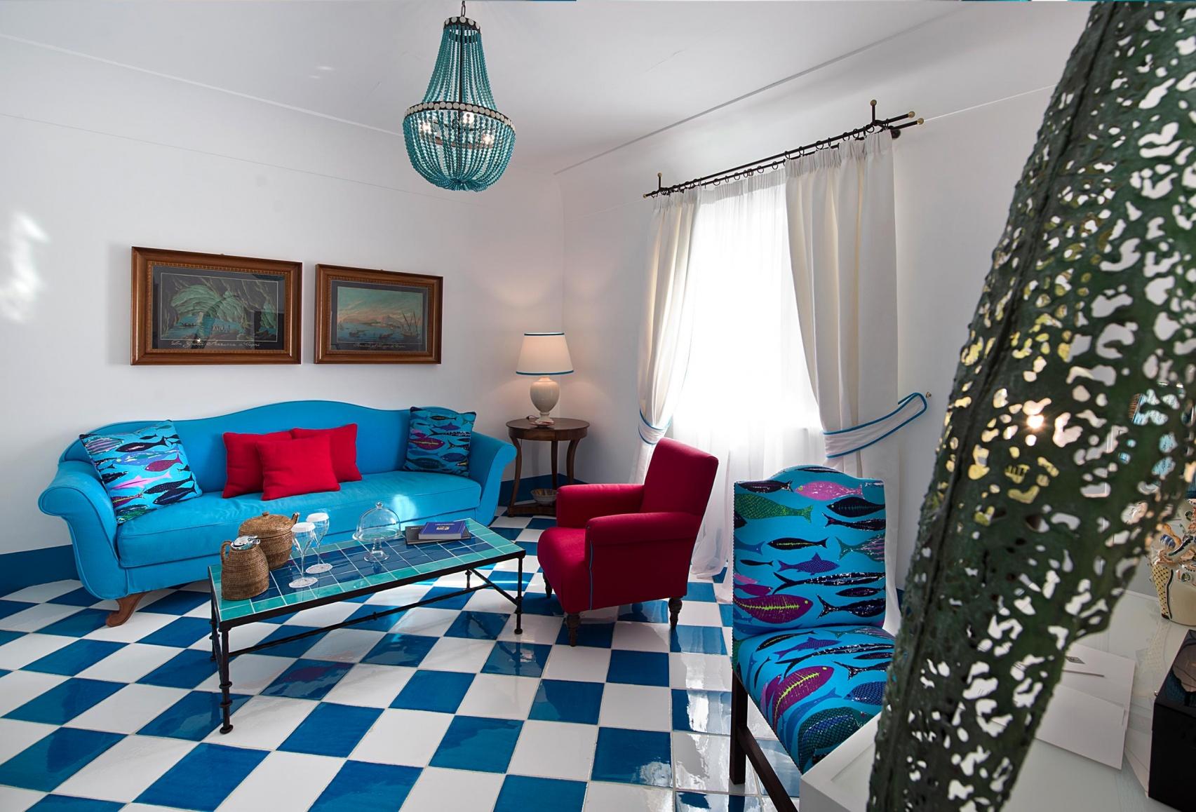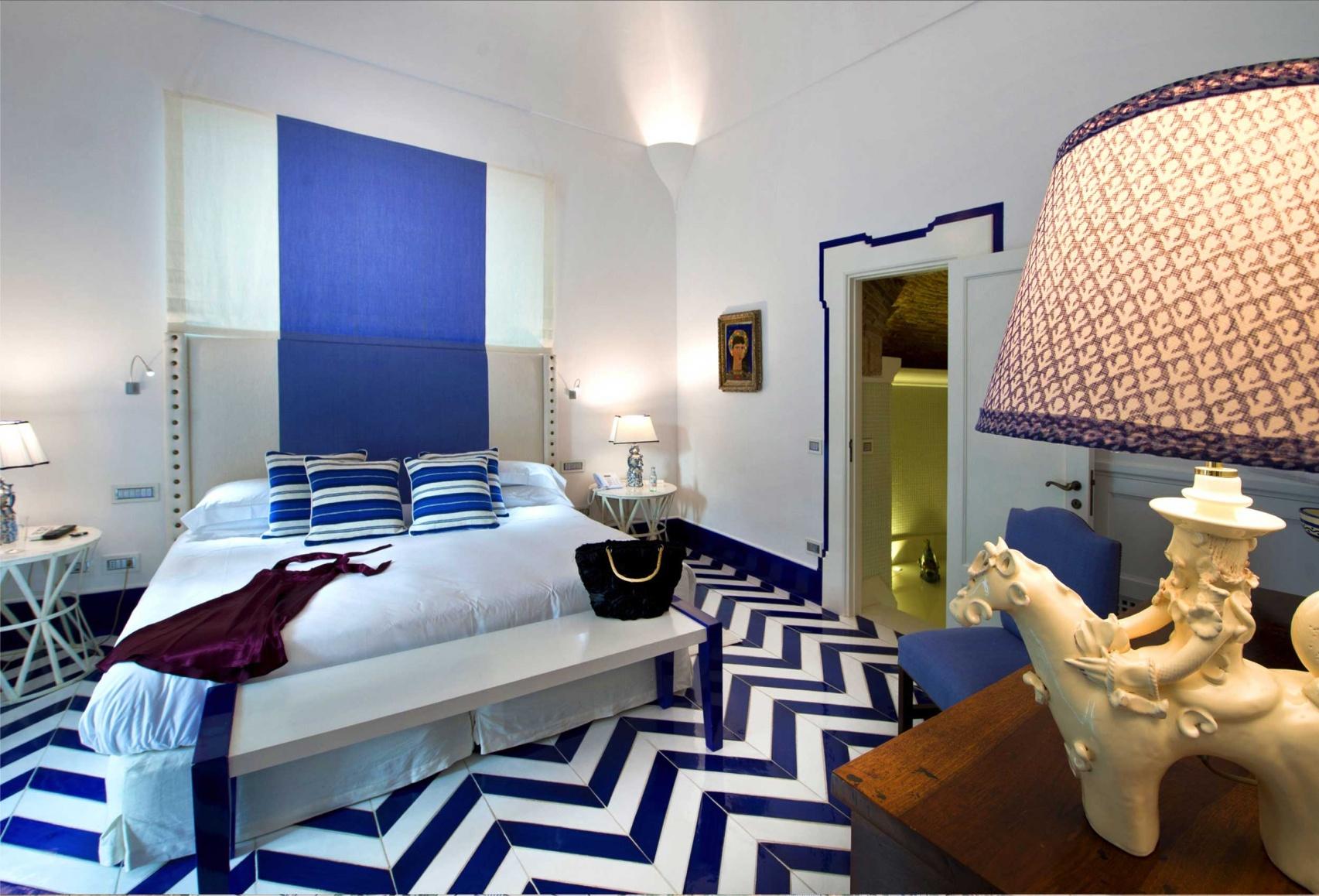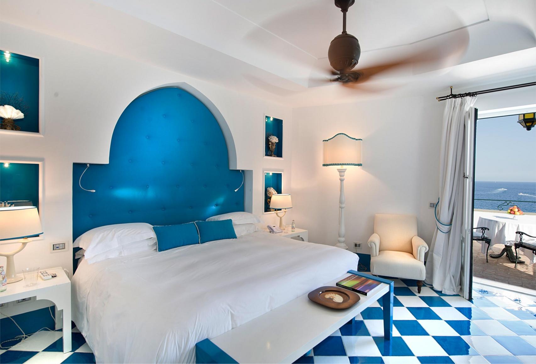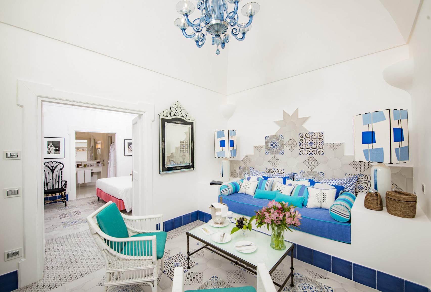 Aida Suite: номер оформлен в средиземноморском стиле. В декоре интерьера присутствует большое разнообразие голубых оттенков и арабских мотивов, типичных для Позитано. Необычайно теплая атмосфера в номере создается благодаря многочисленным произведениям искусства. Состоит из спальни с зоной отдыха, ванной комнаты, террасы с выходом в сад.