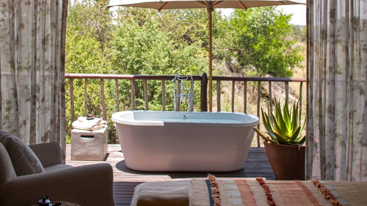 Terrace Suite: 88 м2. Угловой номер на 1 этаже, состоит из спальни с кроватью king-size, гостиной с небольшой раскладной кроватью twin, зоной отдыха и потолочным вентилятором, 2 ванных комнаты (одна с глубокой ванной и отдельным душем), большой террасы с бассейном, душем на открытом воздухе, зоной отдыха и видом на Серенгети. Размещение – 3 взрослых или 2 взрослых + 2 ребенка.