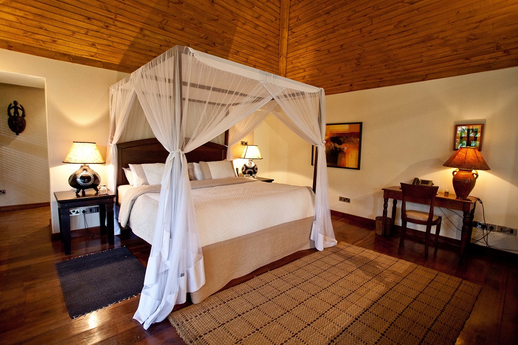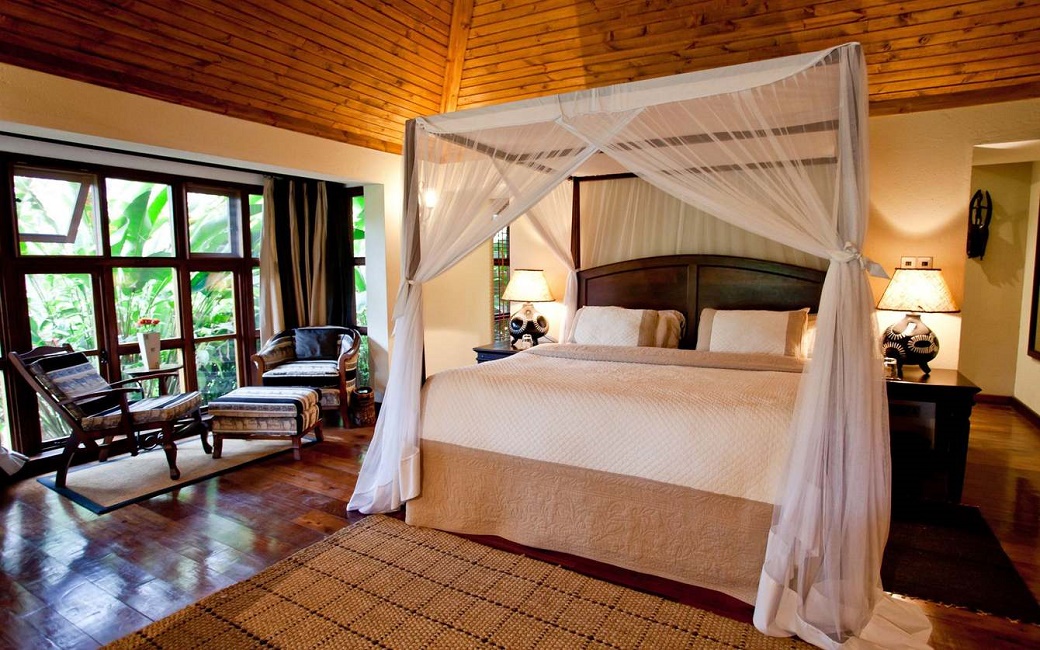 Каждый из шести просторных садовых домиков индивидуально оформлен с уникальным сочетанием африканского искусства и старой мебели в колониальном стиле.