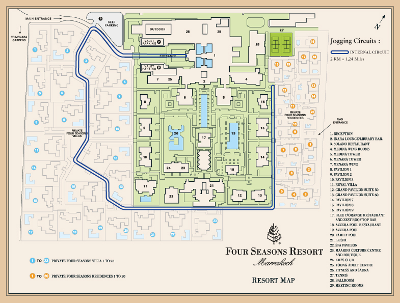 В комплекс Four Seasons Resort Marrakesh 5* входит 23 виллы, 20 резиденций, главный корпус и несколько зданий общего пользования (спа, рестораны, детский клуб) и 2 бассейна, которые расположились на 16 гектарах в центре Марракеша.