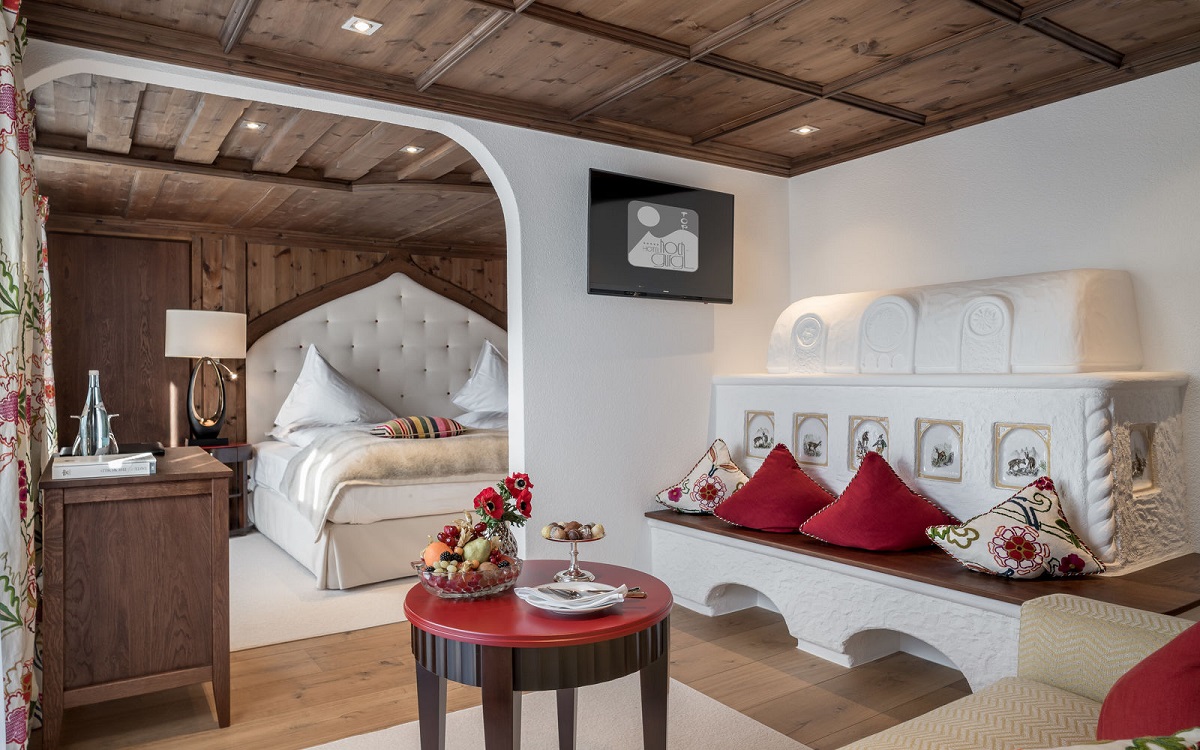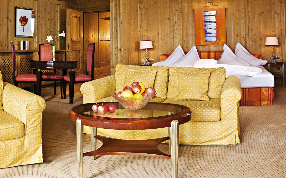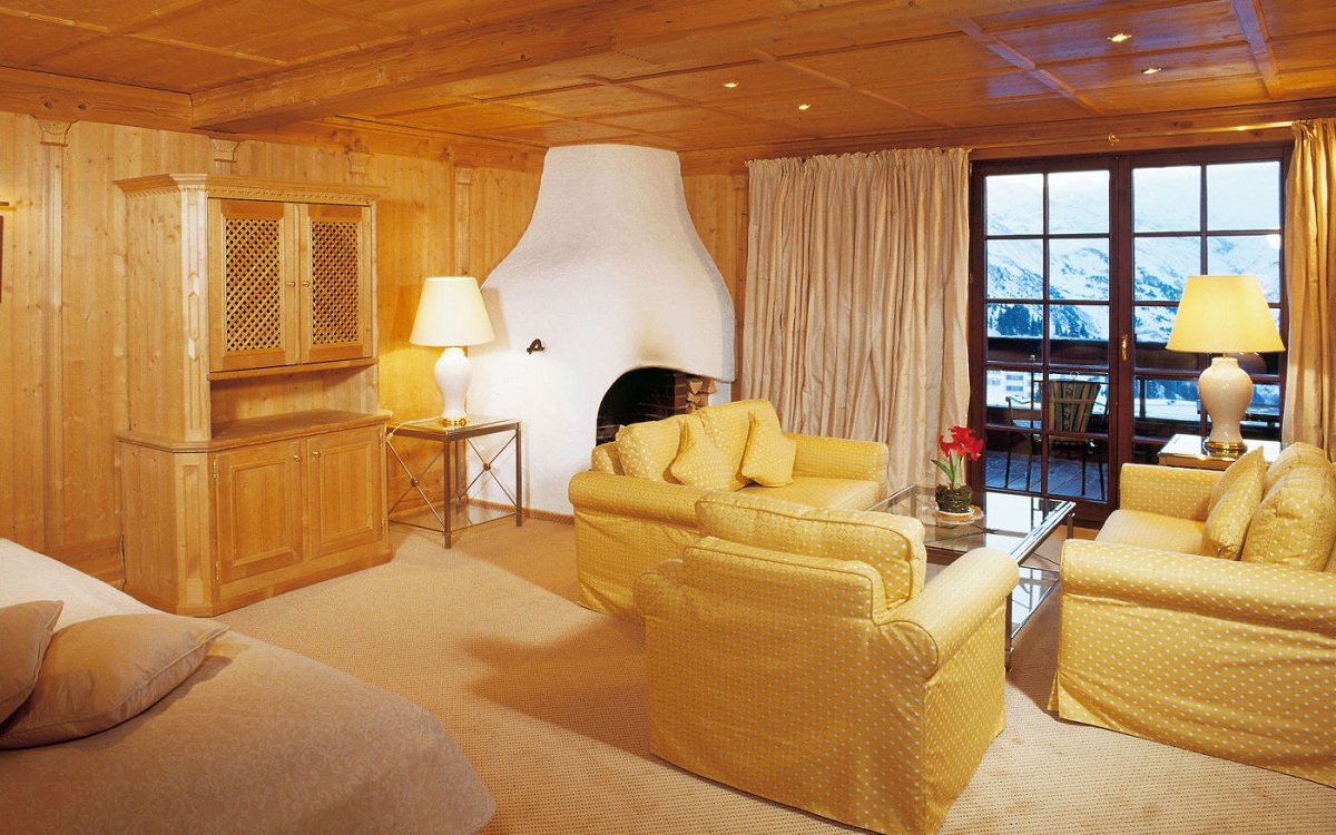 Prince's Suite 66м2 - однокомнатный номер в тирольском стиле с видом на горы. Гостиная зона с камином, мягкой мебелью, в ванной комнате душевая кабина и ванна.