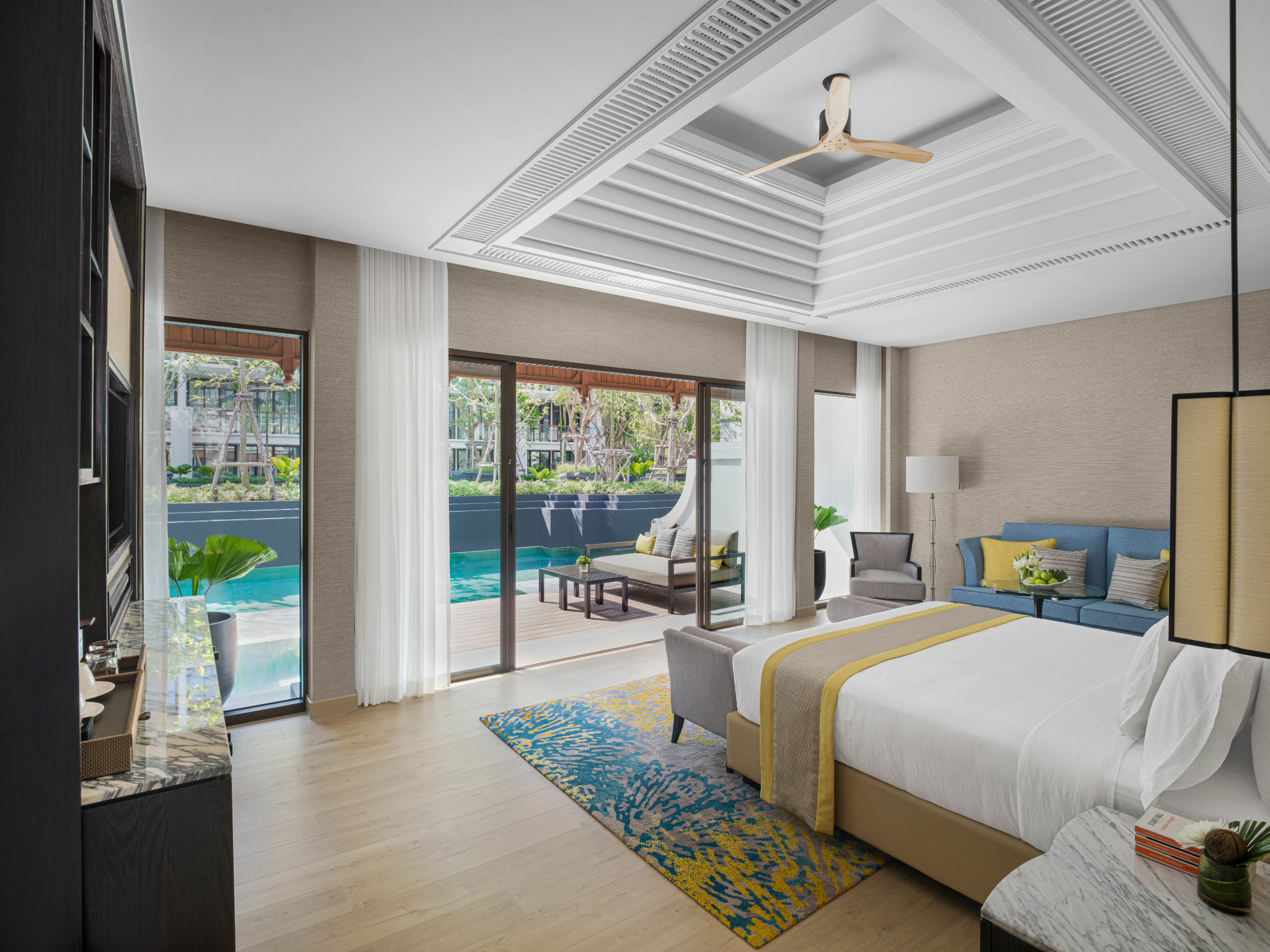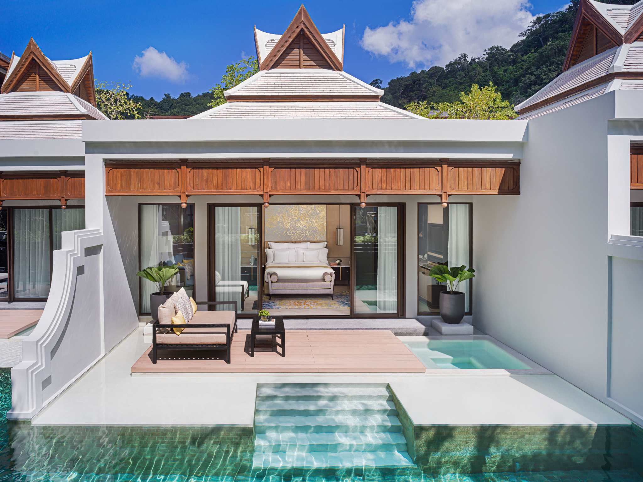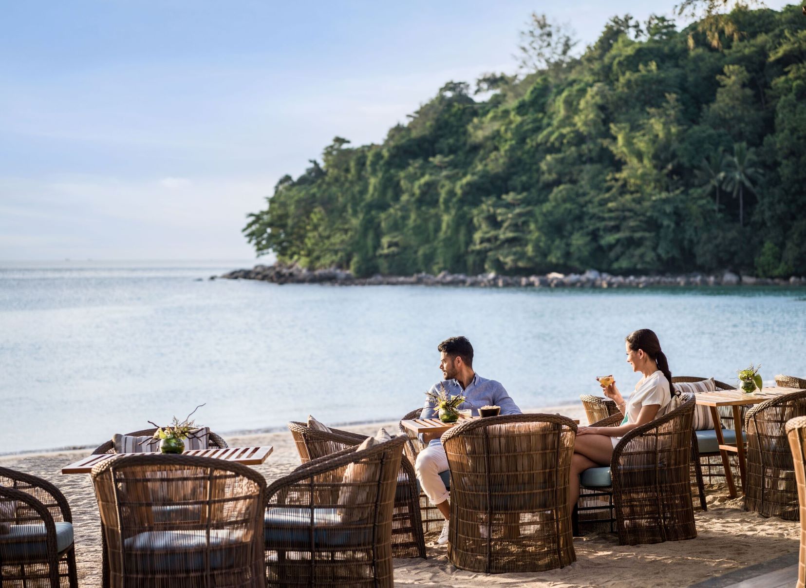 Интерьеры выполнены в элегантном сочетании насыщенных и естественных цветов, а из окон открываются великолепные виды на океан, лагуну, горы. Тщательно разработанный стиль каждого номера, люкса и виллы объединяет элементы традиционного тайского искусства и современный дизайн в гармоничном сочетании с природным ландшафтом отеля.