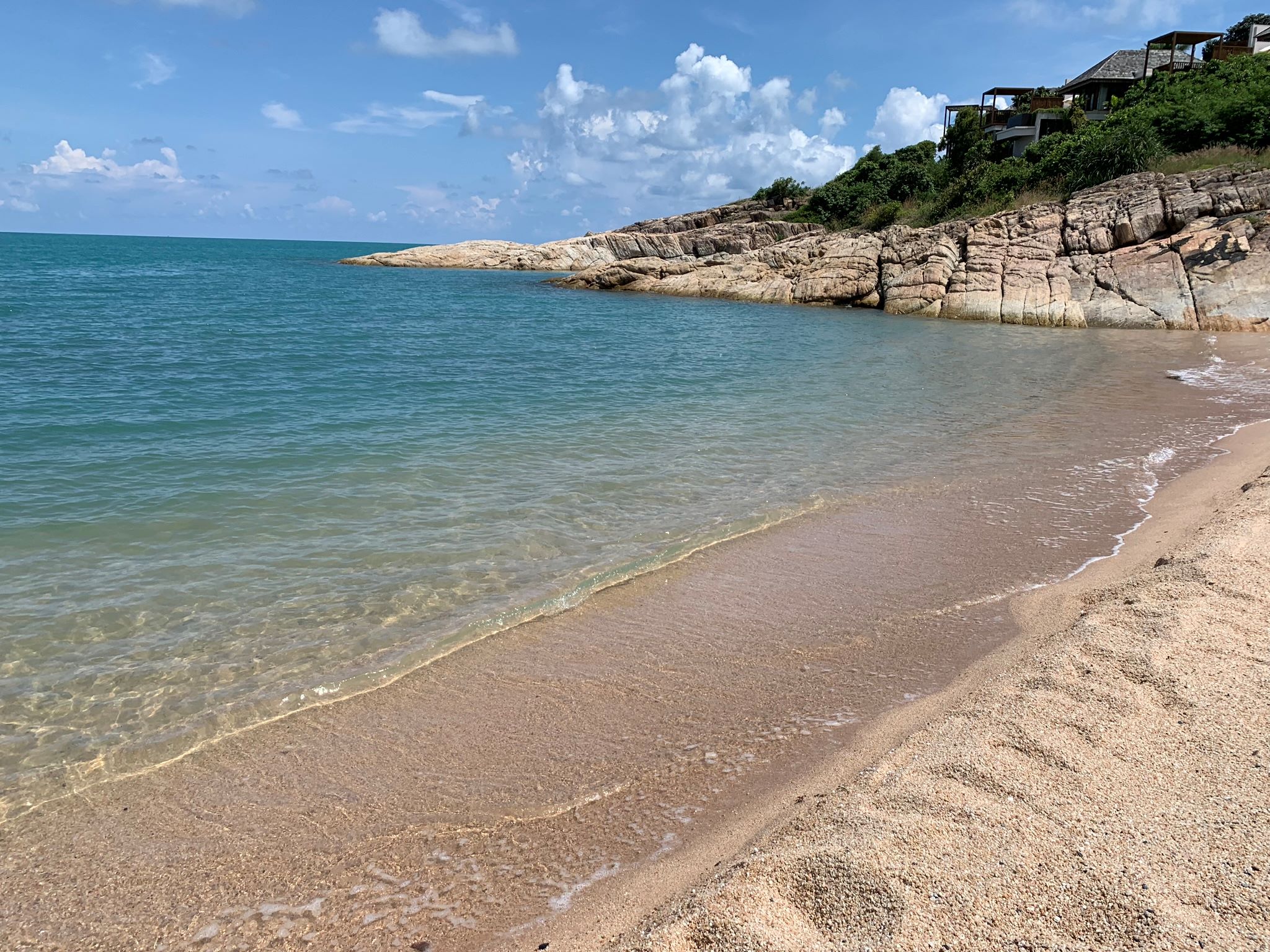 Пляж собственный, расположенный в небольшой бухте, недоступен для сторонней публики. Песок натуральный местный (кристаллы песка местами крупные - это из-за розовых гранитных скал, которые окружают бухту).