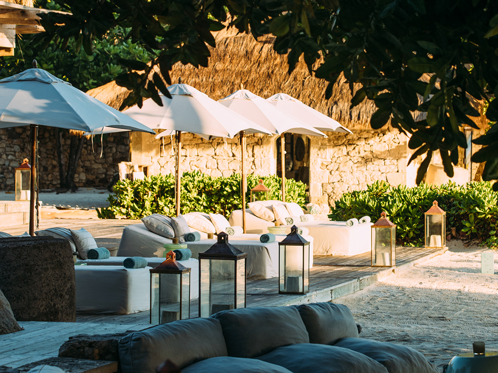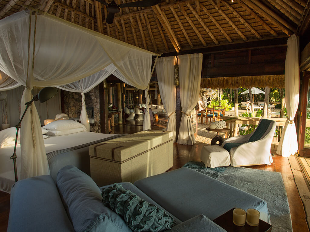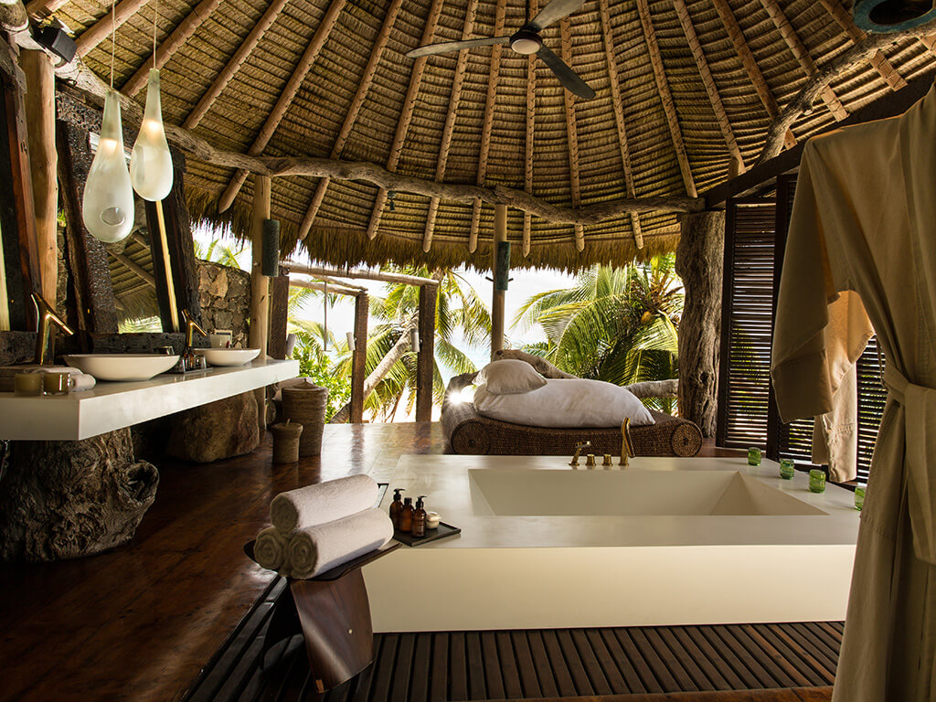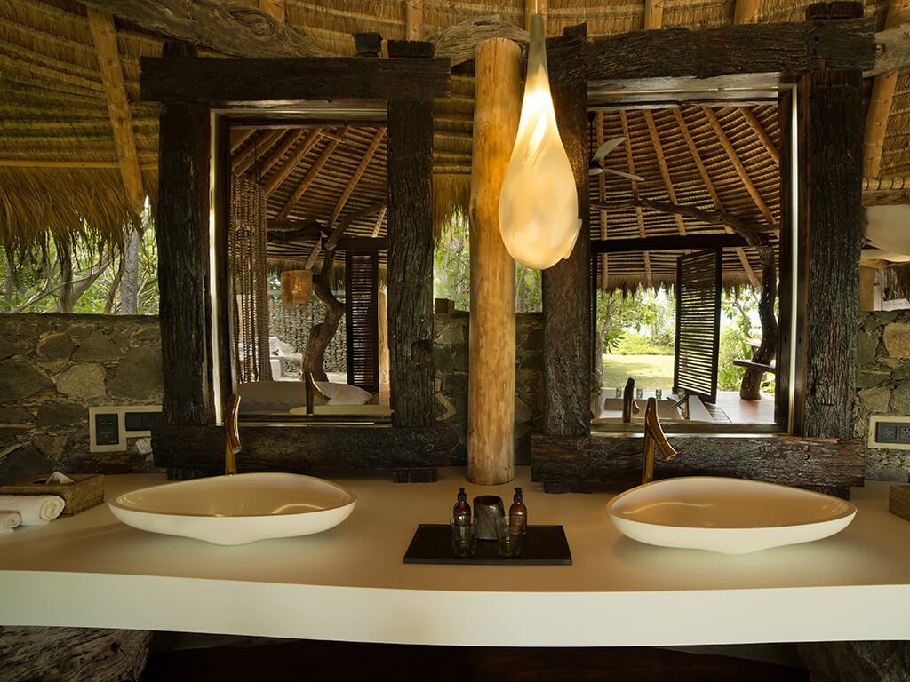 10 Beachfront villa (каждая 450 кв.м.). Виллы выполнены в стиле африканских лоджей, в интерьерах использованием только натуральные материалы: дерево, камень, натуральные ткани. Облик вилл идеально вписывается в окружающие ландшафты, не нарушая гармонию природы и давая ощущение полного слияния с ней. Каждая вилла находится на высоте 1 метр над землей, позволяя прохладному морскому бризу беспрепятственно проникать в помещение. Cостоит из основной спальни с гардеробной и рабочей зоной, ванной комнаты, смежной с основной спальней, с мраморной ванной и 2 душами, один из которых находится на открытом воздухе, дополнительной комнаты, которую можно использовать как кабинет, гостиную, кинотеатр или в качестве второй спальни для детей до 19 лет, кухни, гостиной и обеденной зоны, глубоководного бассейна с зоной отдыха. Из каждой виллы, расположенной на верхней границе лесной зоны, со стороны восточного пляжа, открывается захватывающий вид на лужайки и на лазурные воды Индийского океана, и, конечно, гости этих вилл могут любоваться восходом солнца.