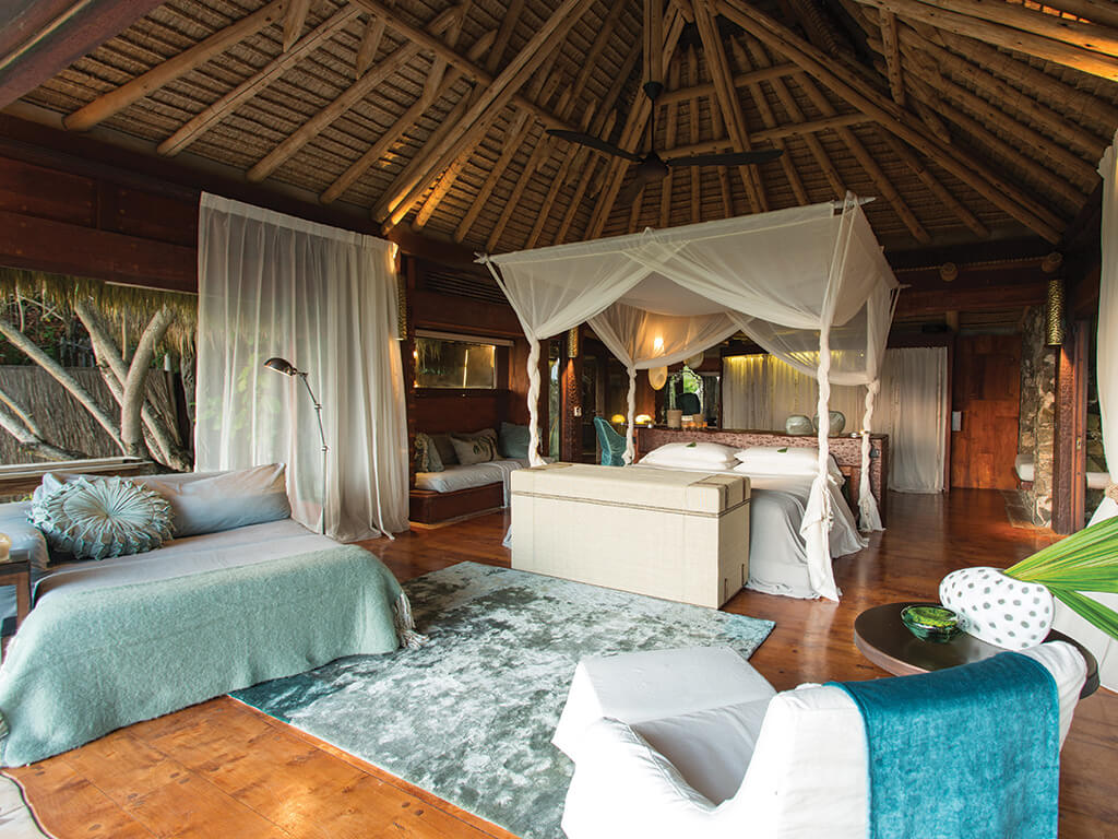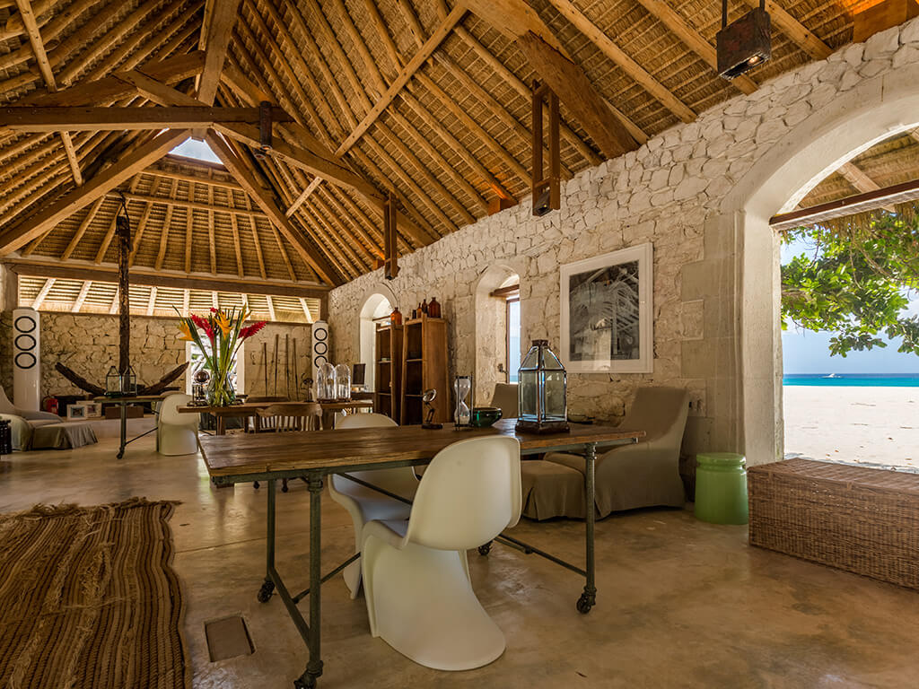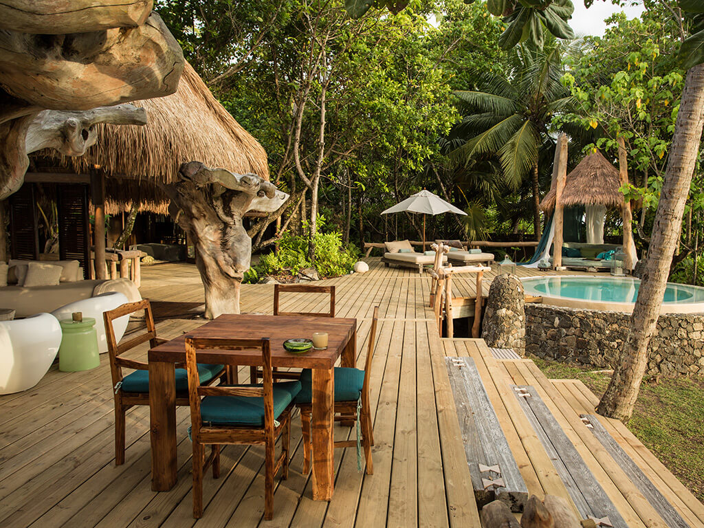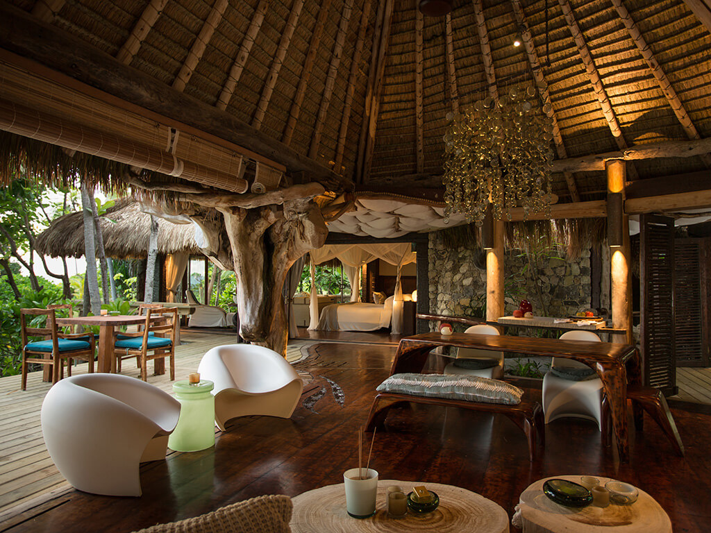 10 Beachfront villa (каждая 450 кв.м.). Виллы выполнены в стиле африканских лоджей, в интерьерах использованием только натуральные материалы: дерево, камень, натуральные ткани. Облик вилл идеально вписывается в окружающие ландшафты, не нарушая гармонию природы и давая ощущение полного слияния с ней. Каждая вилла находится на высоте 1 метр над землей, позволяя прохладному морскому бризу беспрепятственно проникать в помещение. Cостоит из основной спальни с гардеробной и рабочей зоной, ванной комнаты, смежной с основной спальней, с мраморной ванной и 2 душами, один из которых находится на открытом воздухе, дополнительной комнаты, которую можно использовать как кабинет, гостиную, кинотеатр или в качестве второй спальни для детей до 19 лет, кухни, гостиной и обеденной зоны, глубоководного бассейна с зоной отдыха. Из каждой виллы, расположенной на верхней границе лесной зоны, со стороны восточного пляжа, открывается захватывающий вид на лужайки и на лазурные воды Индийского океана, и, конечно, гости этих вилл могут любоваться восходом солнца.