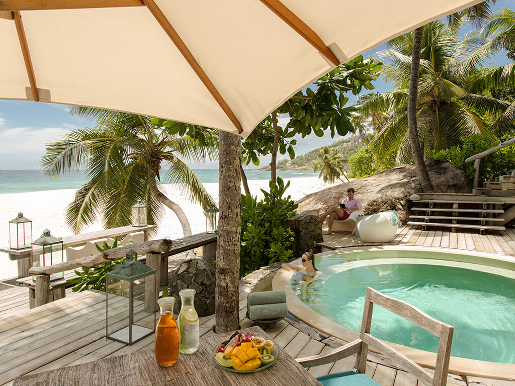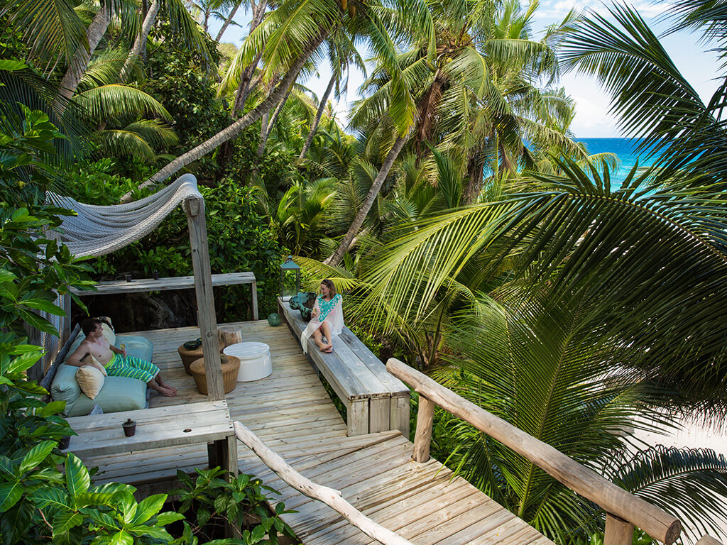 1 Villa North Island (750 кв.м.). Единственная вилла этой категории отличается уникальным обособленным расположением в стороне от остальных вилл, Эта уединённая вилла предназначена для размещения только двух гостей. Сложно ошибиться, предположив, что это идеальный вариант размещения для медового месяца или романтического путешествия влюбленной пары. Именно в этой вилле остановилась венценосная пара Кейт и принц Уильям во время своего свадебного путешествия. Утонченный дизайн, двухуровневая планировка, впечатляющий размер комнат ставят эту виллу особняком среди других. Вилла расположена прямо на живописном пляже Anse de’s Beach, и частично спрятана в зарослях экзотических деревьев Takamaka. С любой точки виллы открывается потрясающий вид на пляж. Вход в виллу окаймляют изумительные пальмы, создавая естественную арку с видом на пляж. По мосту из стволов казуарины гости попадают в спальню с исключительным видом. Ванная комната - это настоящий шедевр с захватывающим панорамным видом. Ванна размером 1,2 Х 2 м - идеальное место отдыха для двоих. Из ванной комнаты резная лестница ручной работы ведет на солнечную террасу, где есть тропический душ, а чуть выше на террасе расположена зона СПА на открытом воздухе.