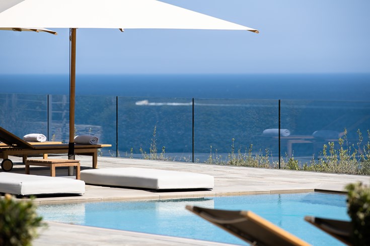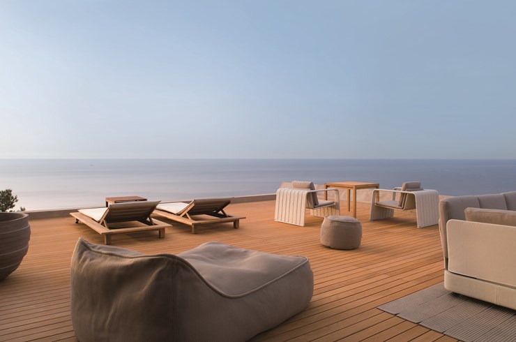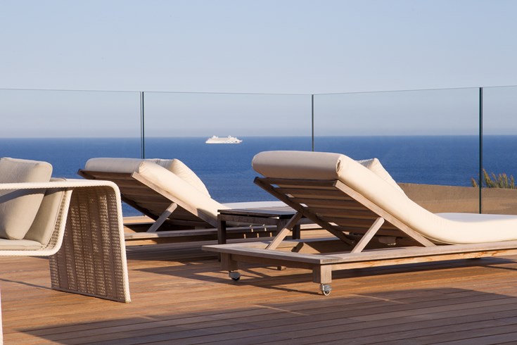 Escalet Suite: 120 м2 + терраса 210 м2. Номер с панорамными, от пола до потолка окнами, отделанный натуральным камнем и светлым деревом, состоит из двух спален с кроватями king-size или twin, просторной гостиной, двух ванных комнат (одна - с ванной и душем, другая - с душем), огромной террасы с видом на море. Максимальное размещение - 3 человека.