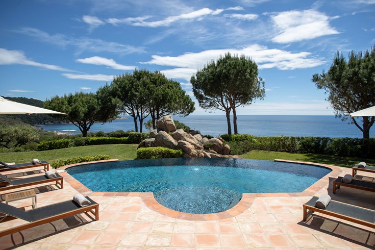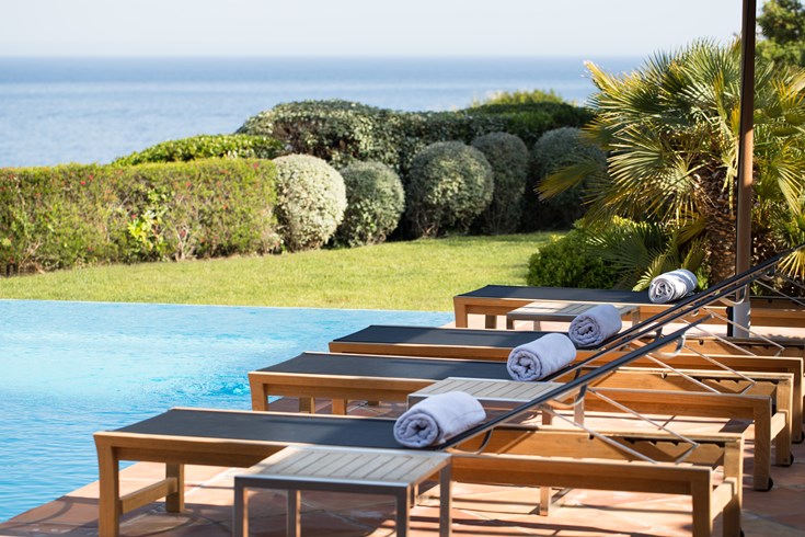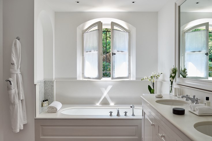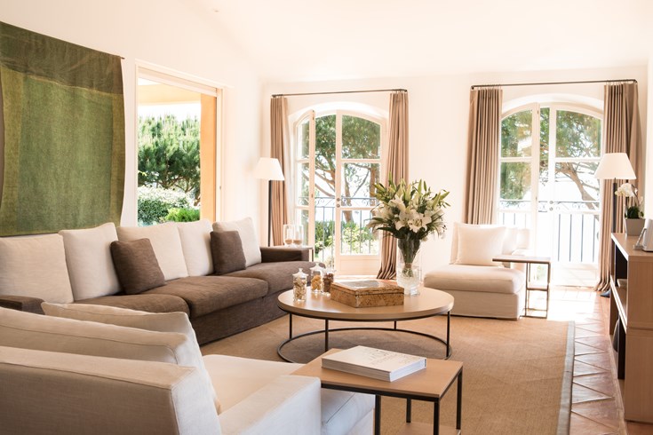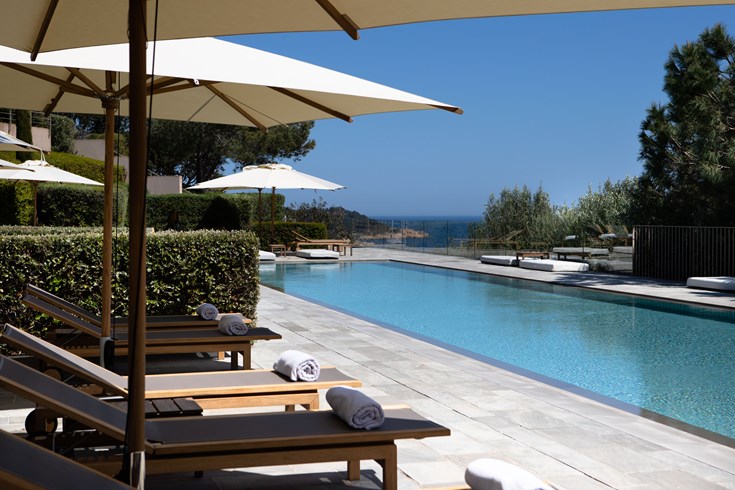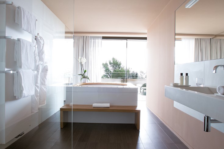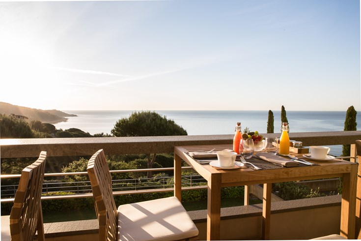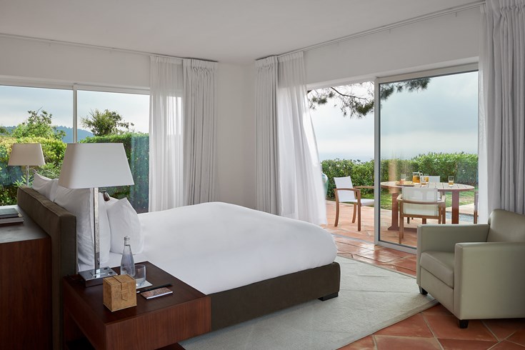 Camarat Suite: 100 м2 + терраса 180 м2. Номер с панорамными, от пола до потолка окнами, отделанный натуральным камнем и светлым деревом, состоит из двух спален с кроватями king-size или twin, гостиной, ванной комнаты с ванной и душем, огромной террасы с садом с видом на море. Максимальное размещение - 4 взрослых+1 маленький ребенок.