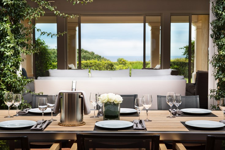 5 Bedroom Villa № 5: 365 м2. Расположена в восточной части комплекса, имеет вид на море, включает: пять спален с собственными ванными комнатами и отдельными туалетными комнатами, гостевую туалетную комнату, гостиную со столовой и полностью оборудованной кухней, патио с открытым бассейном, гараж на 2 места, открытую парковку на 4 места, частный сад и окружающую виллу территорию в 3800 м2. Во всех спальнях на вилле имеются сейфы. Максимальное размещение - 10 человек.