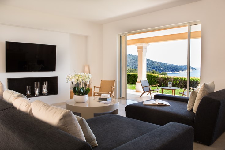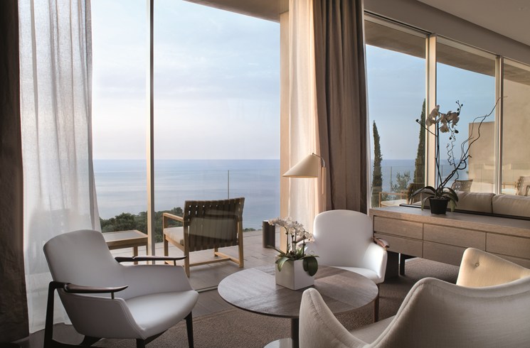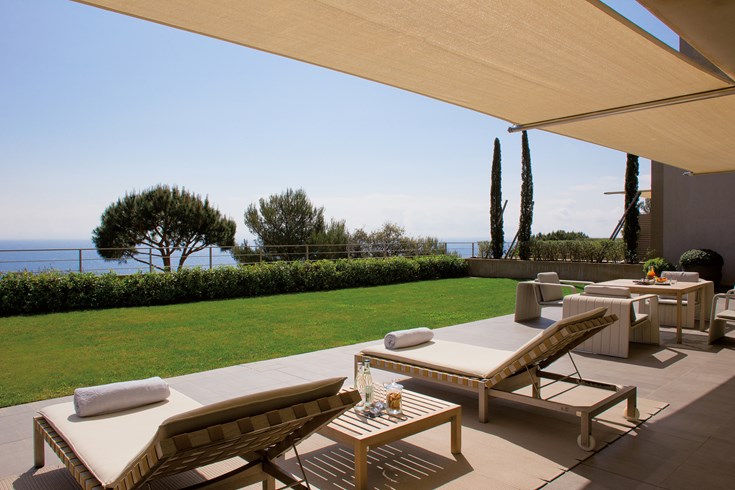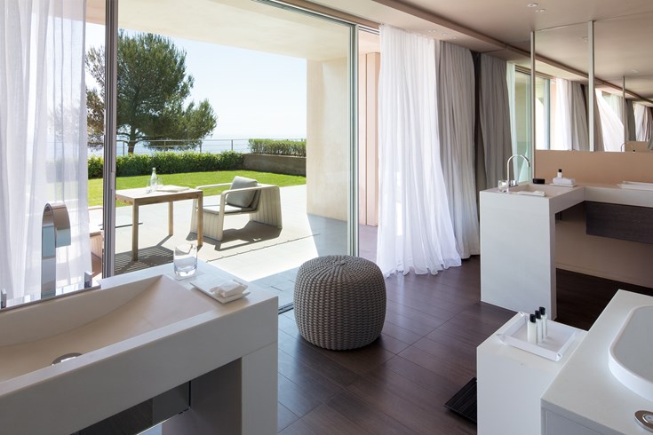 Premiere Suite: 95 м2 + терраса 180 м2. Номер с панорамными, от пола до потолка окнами, отделанный натуральным камнем и светлым деревом, состоит из спальни с кроватью king-size, гостиной, ванной комнаты с ванной и душем, просторной террасы с видом на море и выходом в сад. Максимальное размещение - 3 человека.