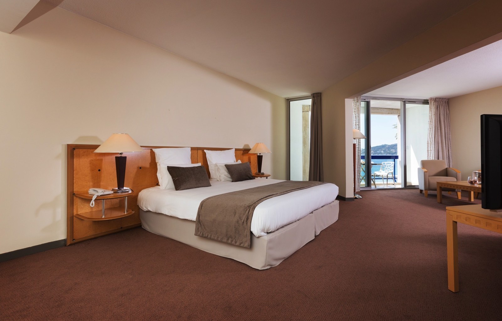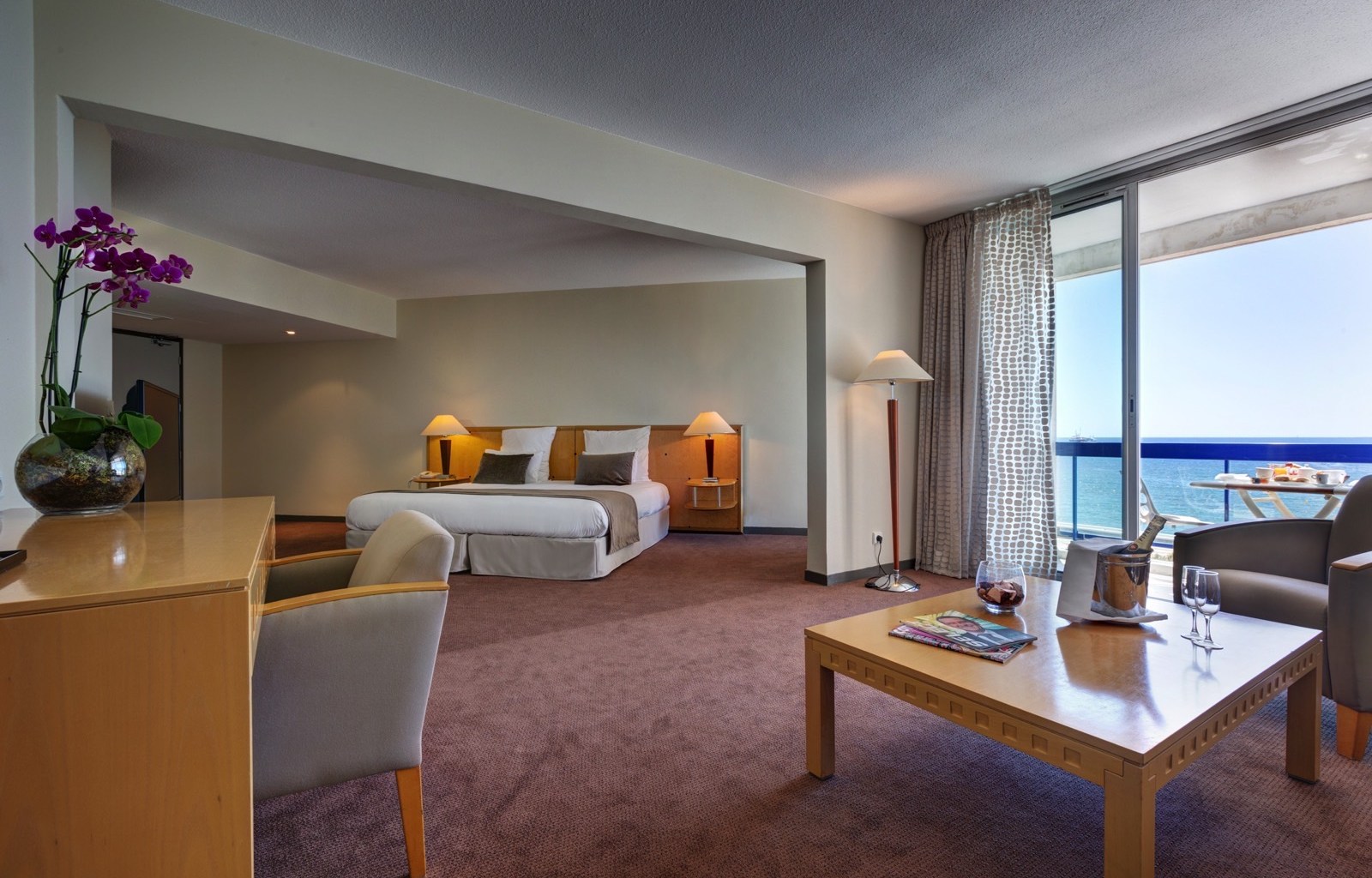 Deluxe Junior Suite: 50 м2. Состоит из спальни c двуспальной кроватью, гостиной зоны, ванной комнаты с ванной и душем, балкона с видом на море. Максимальное размещение - 3 человека.