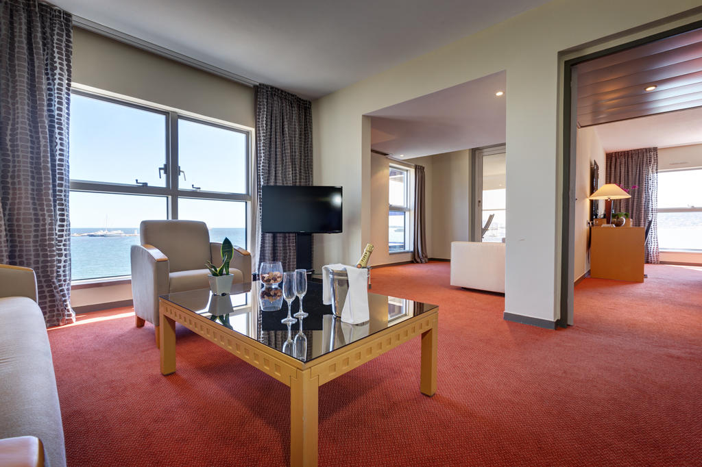 Deluxe Suite: 60 м2. Состоит из спальни с двуспальной кроватью, отдельной гостиной с диваном, который может быть использован как дополнительной спальное место, двух ванных комнат, балкона с видом на море. Некоторые номера могут быть без гостиной. Максимальное размещение - 4 человека.
