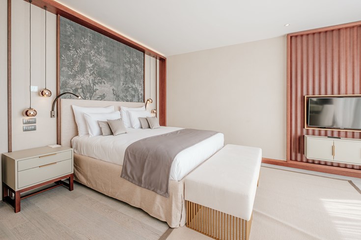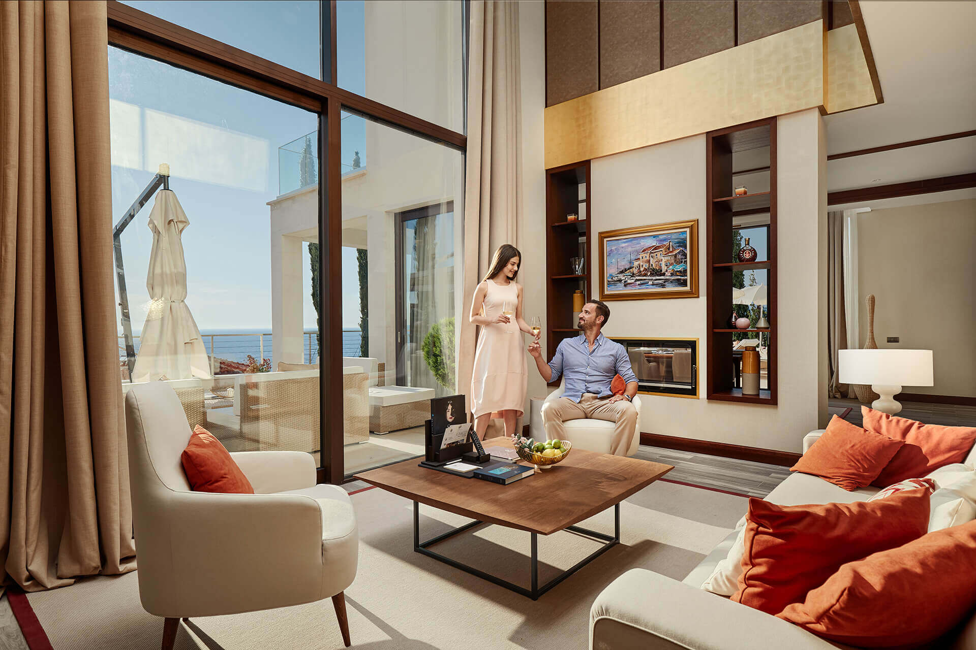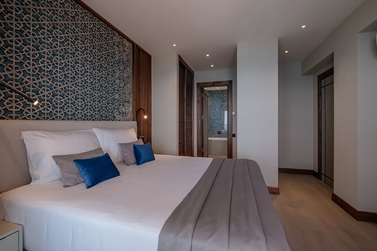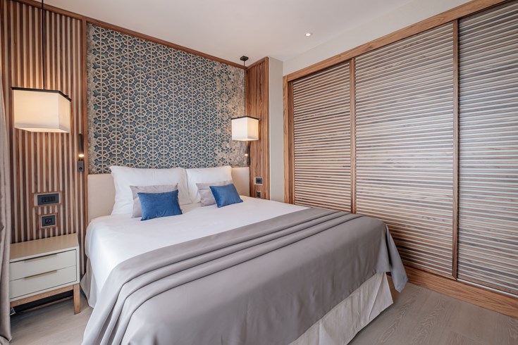 Deluxe Suite: 100-114 м2. Состоит из двух спален с кроватью king-size, гостиной с обеденной зоной и мини-кухней, ванной комнаты с ванной и ливневым душем, балкона с зоной отдыха и видом на море.
