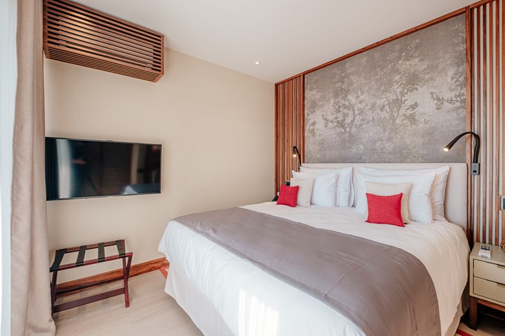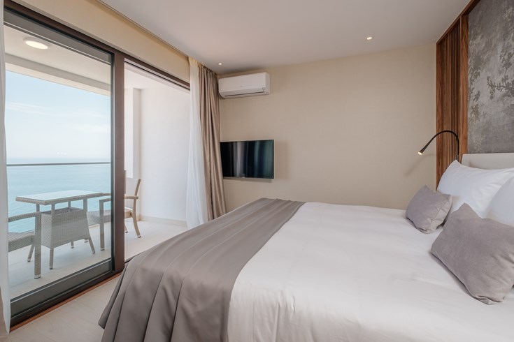 Junior Suite: 43-55 м2. Состоит из спальни с кроватью king-size, гостиной зоной, мини-кухней, ванной комнаты с ванной и ливневым душем, балкона с видом на море. Номера расположены на мансардном этаже (лифт поднимается только до предыдущего этажа, нужно пройти один этаж по лестнице).