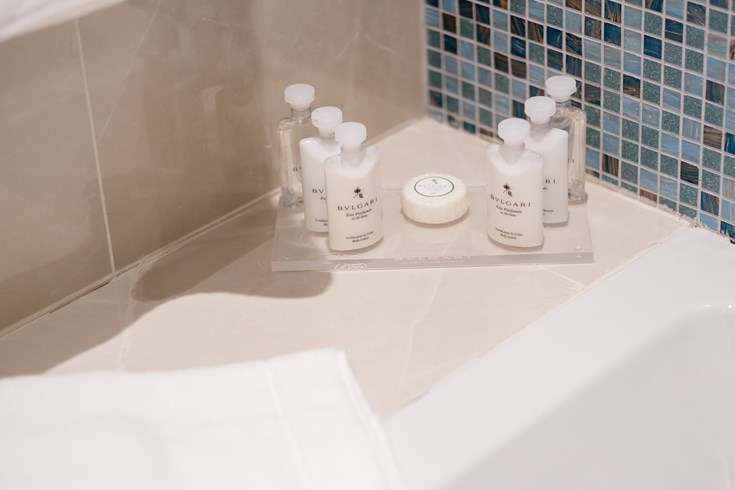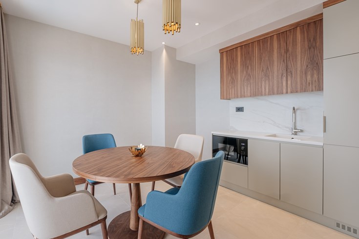 Suite: 52-59 м2. Состоит из спальни с кроватью king-size, гостиной с обеденной зоной и мини-кухней, ванной комнаты с ванной и ливневым душем, балкона с видом на море.