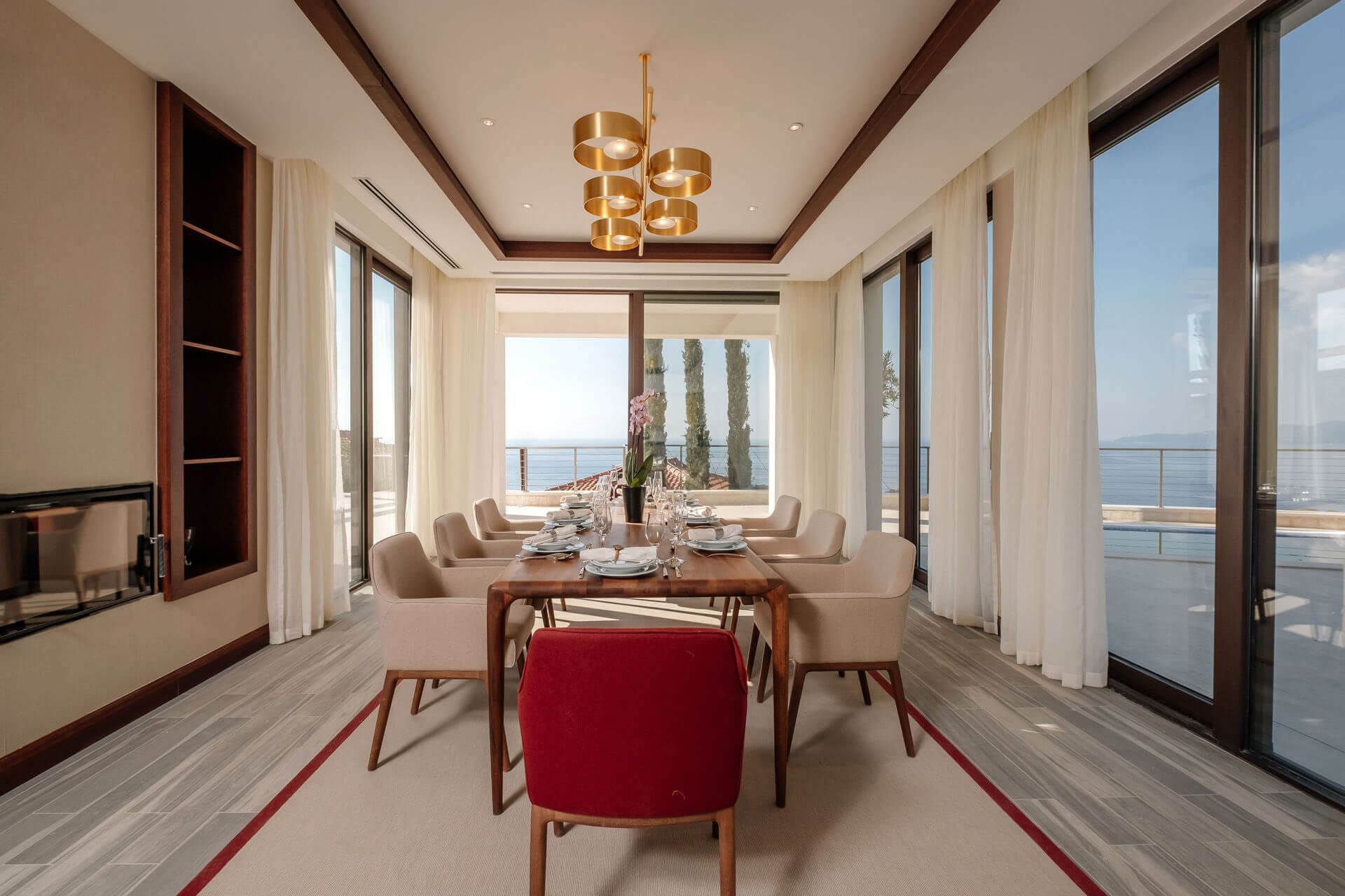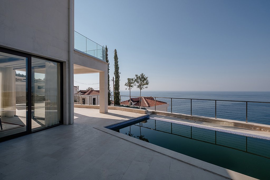 Adriatic Villa: 340 м2. Двухуровневая вилла включает четыре спальни с кроватью king-size, гостиную, столовую, кухню, три ванные комнаты с ванной/душем, гараж на два места, балконы, просторную террасу с бассейном (31 м2), зоной отдыха и видом на море.