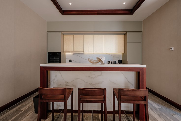 Deluxe Villa: 365 м2. Включает три спальни с кроватью king-size, гостиную, столовую, кухню, четыре ванные комнаты с ванной/душем, парковку, балконы, просторную террасу с бассейном (32 м2), зоной отдыха и видом на море.