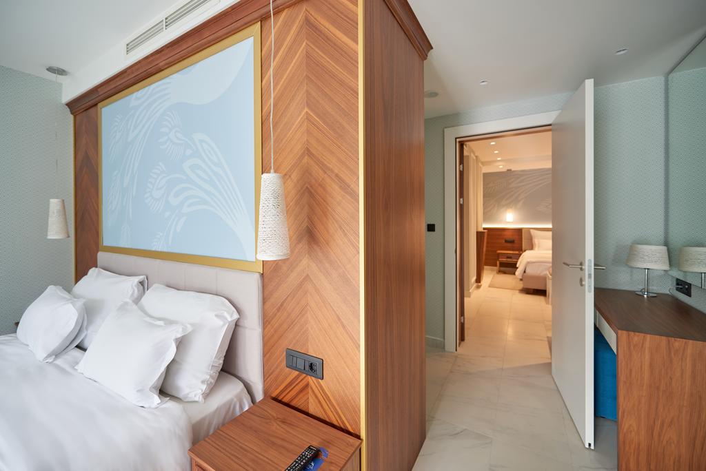 Superior Family Apartment: 64-68 м2. Семейный номер представляет собой соединение соседних номеров Dobrota Suite и Luxury Room и включает две спальни, гостиную, две ванные комнаты и две террасы. Максимальное размещение – 5 взрослых + 2 ребенка.