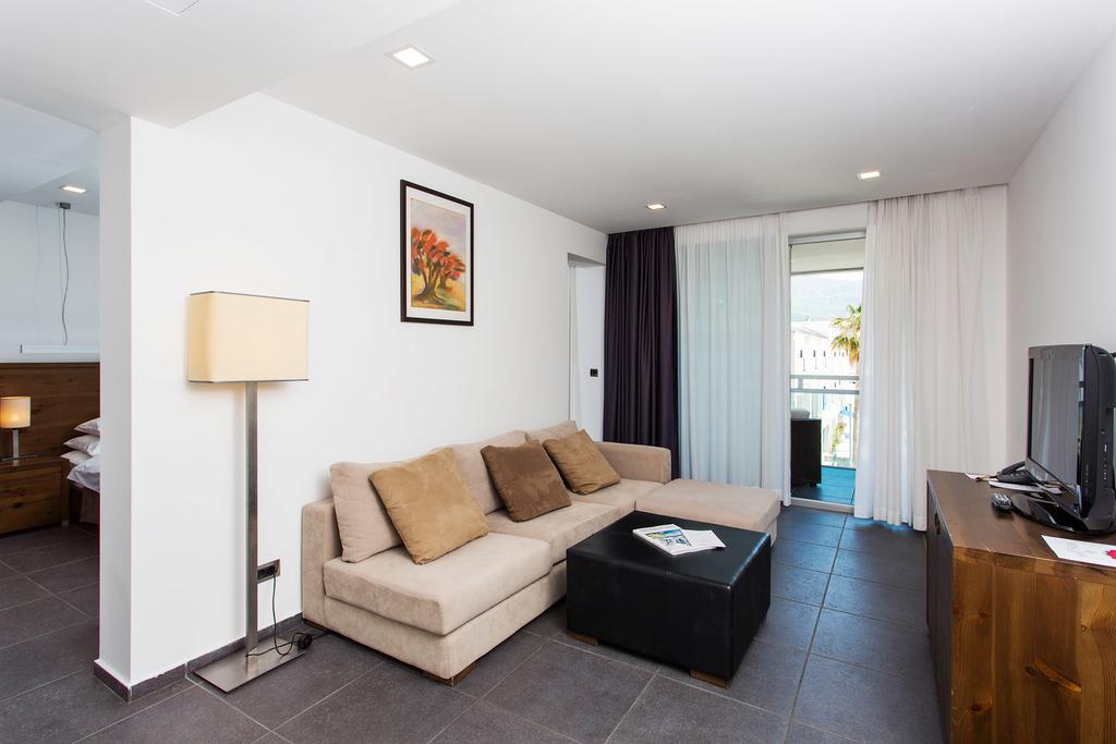 Elite Suite: 81-88 м2. Эти просторные апартаменты с современным интерьером, спроектированные индивидуально, являются апартаментами самого высшего класса и представляют собой эксклюзивную роскошь, которую Черногория предлагает для деловых целей или отдыха вдвоем. Они состоят из светлых комнат, просторных ванных комнат, облицованных натуральным камнем, больших гардеробных и элегантных гостиных, которые делают пребывание в этих апартаментах максимально комфортным. Балкон с видом на море.