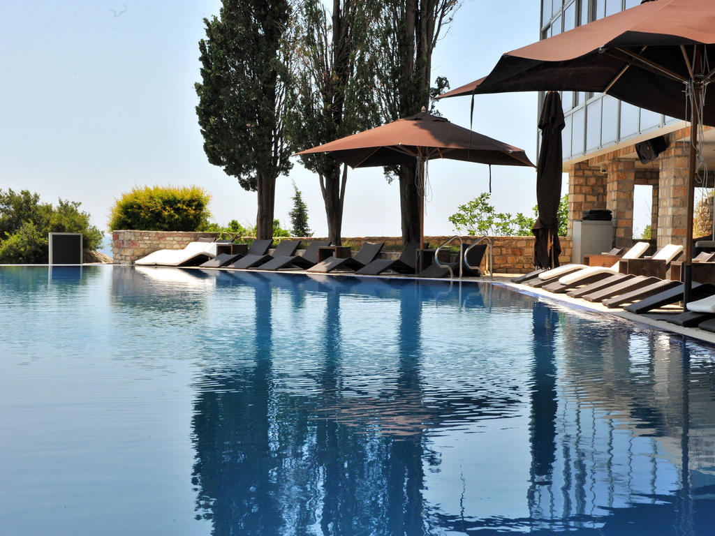 Standard Villa: 55 м2. Вилла, расположенная на холме над отелем, состоит из спальни с кроватью king-size и гардеробом, гостиной зоны, ванной комнаты с отдельной душевой кабиной, балкона с видом на море и город. Дополнением является выход к эксклюзивному бассейну, окруженному кипарисами.