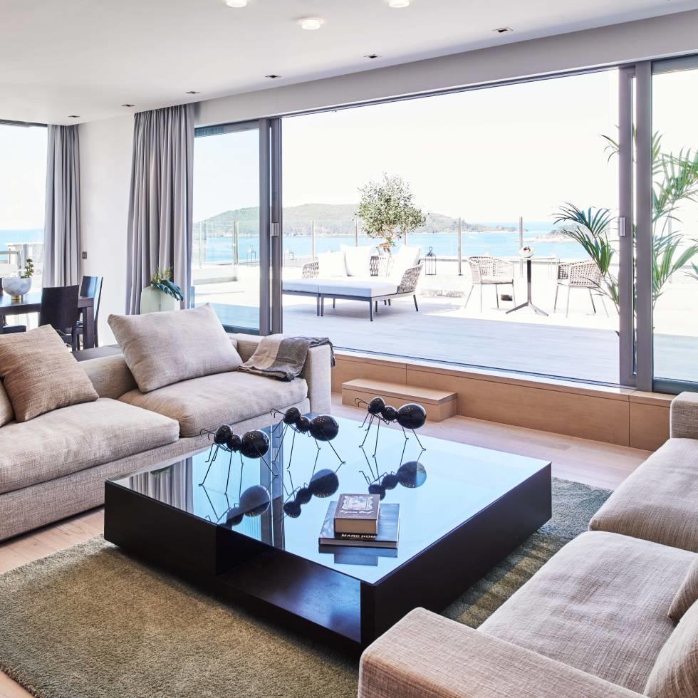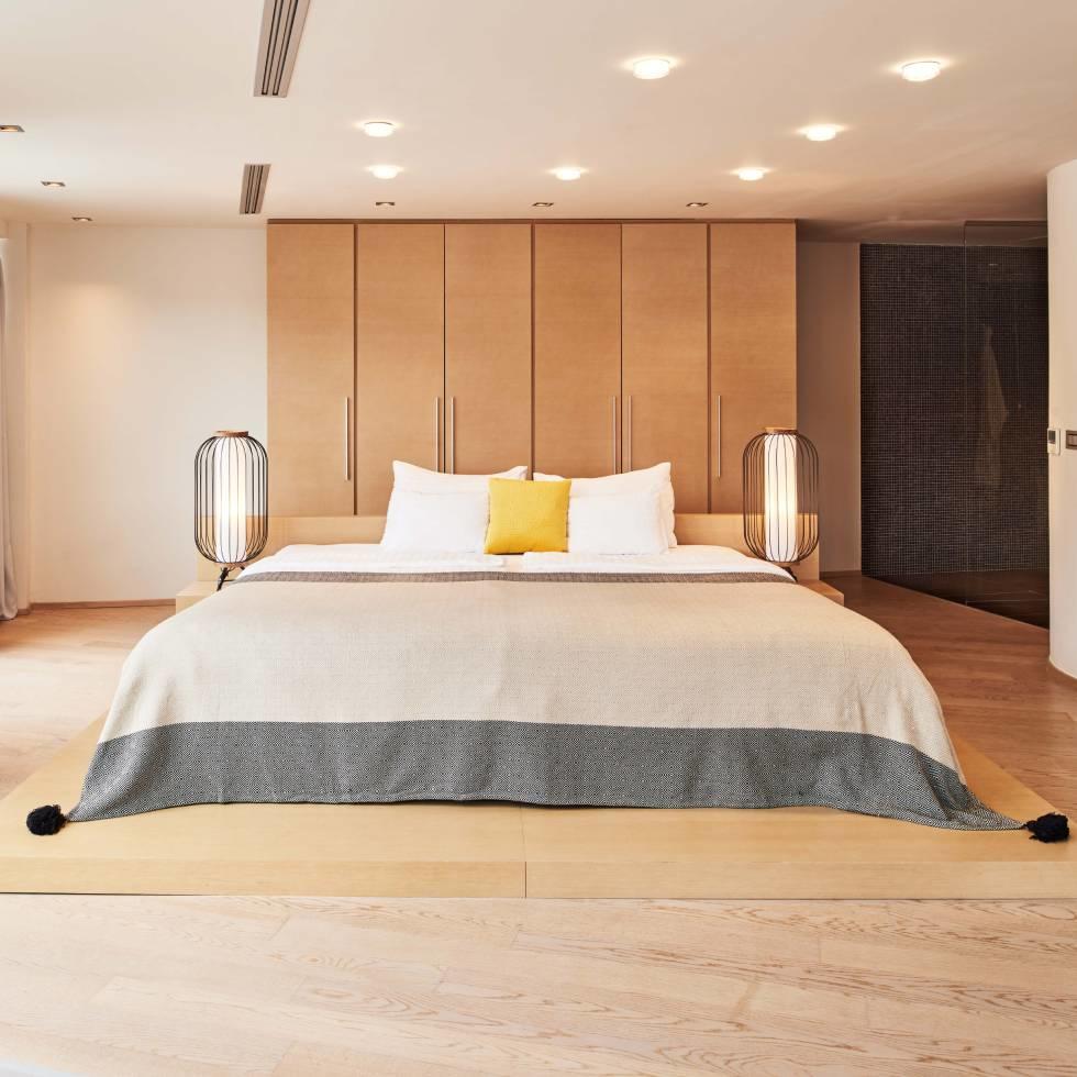 Royal Suite with Jacuzzi. Номер площадью 118 м2, который состоит из спальни, гостиной и ванной комнаты, разделенной стеклянной стеной с душем и джакузи, балкон площадью 38 м2 с видом на море.