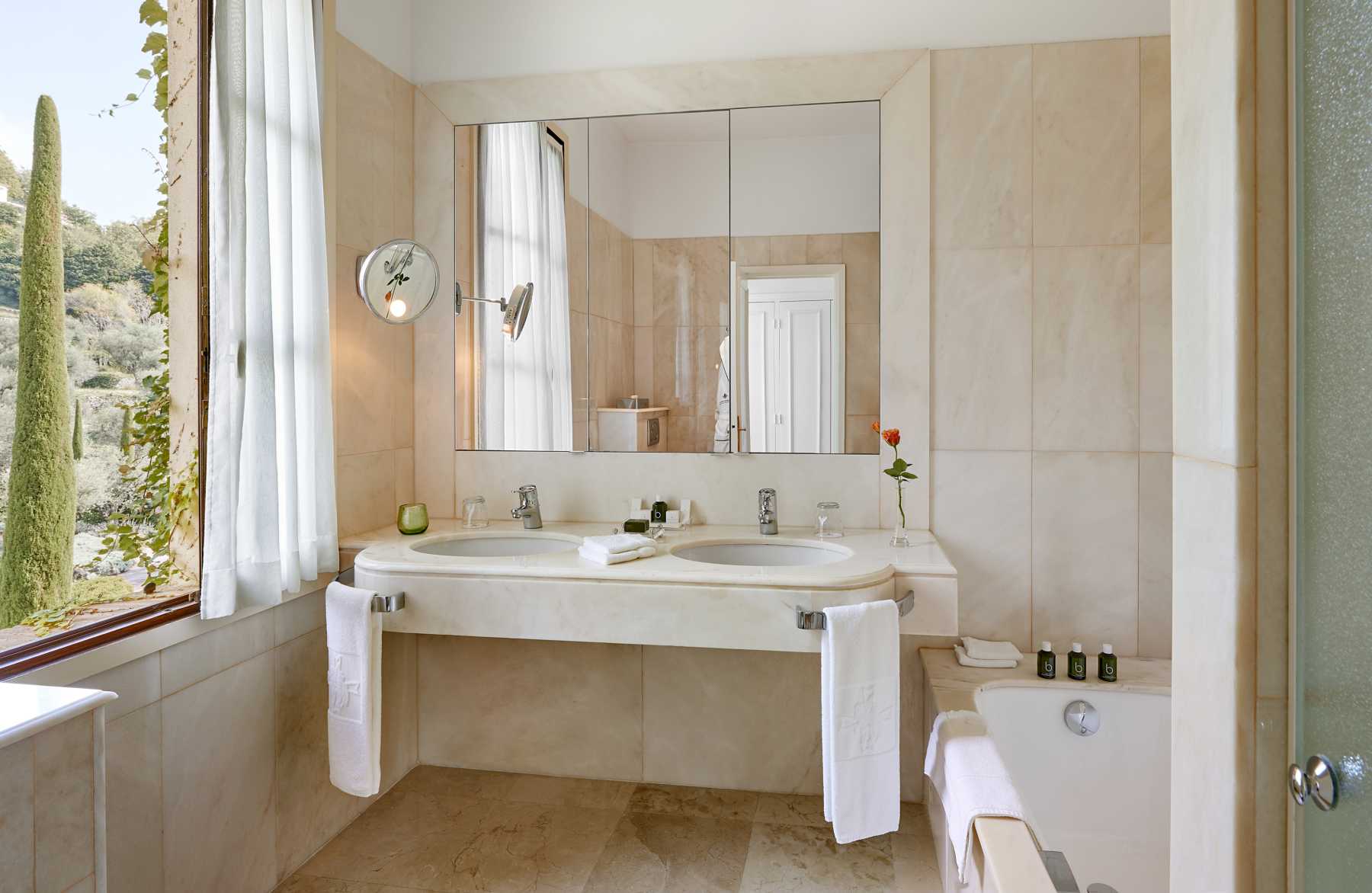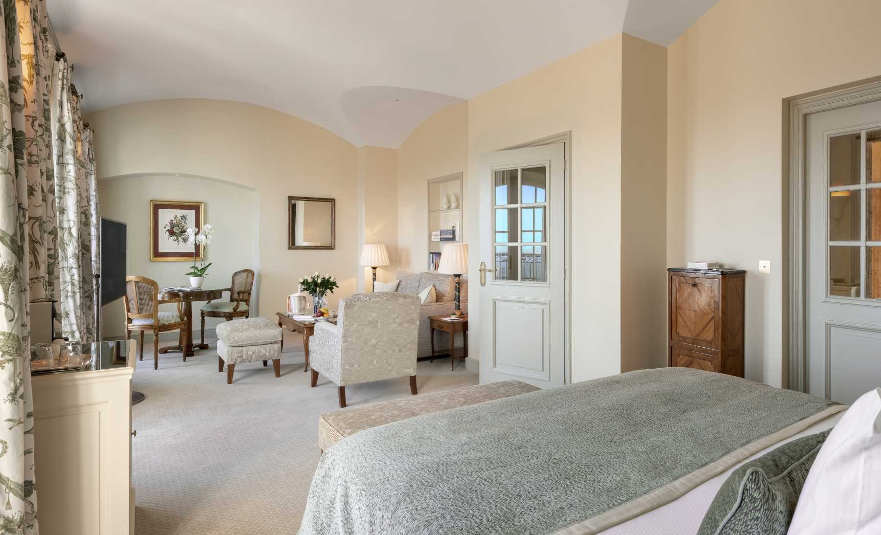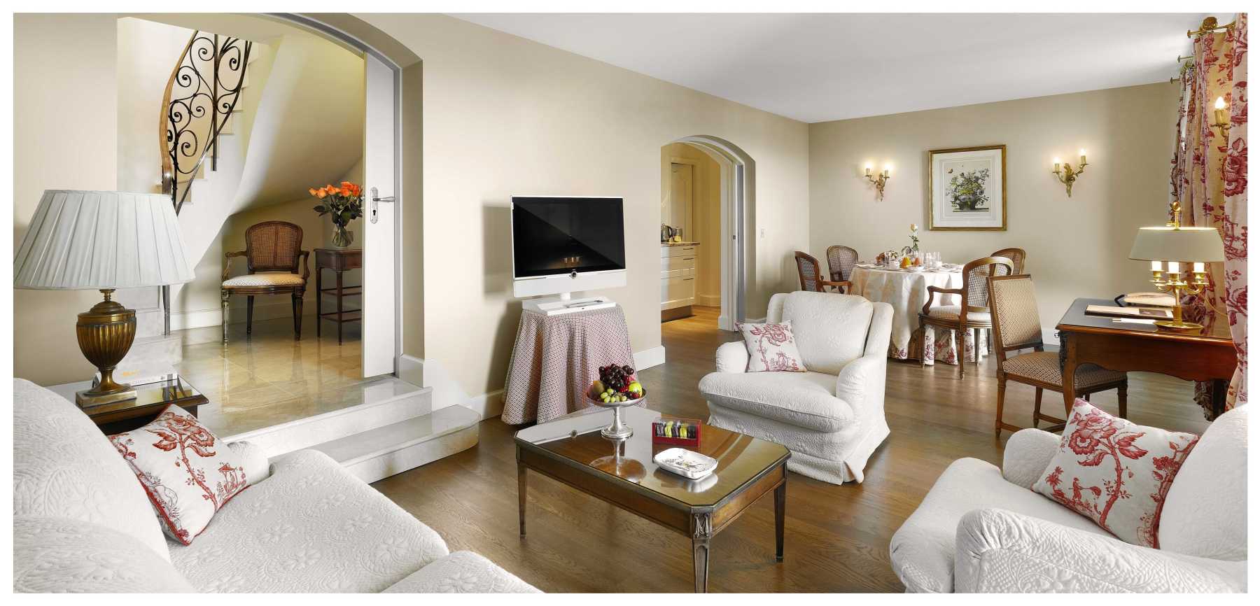 Junior Suite: 35 - 40 м2. Элегантный номер в стиле французского рококо состоит из спальни с кроватью king-size или двумя кроватями twin, зоны отдыха, ванной комнаты, отделанной розовым мрамором. Вид на холмы. В некоторых номерах есть балконы. Максимальное размещение - 2 человека.
