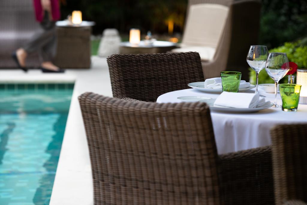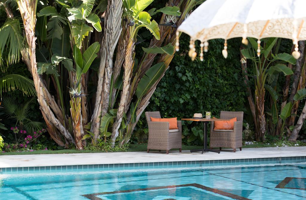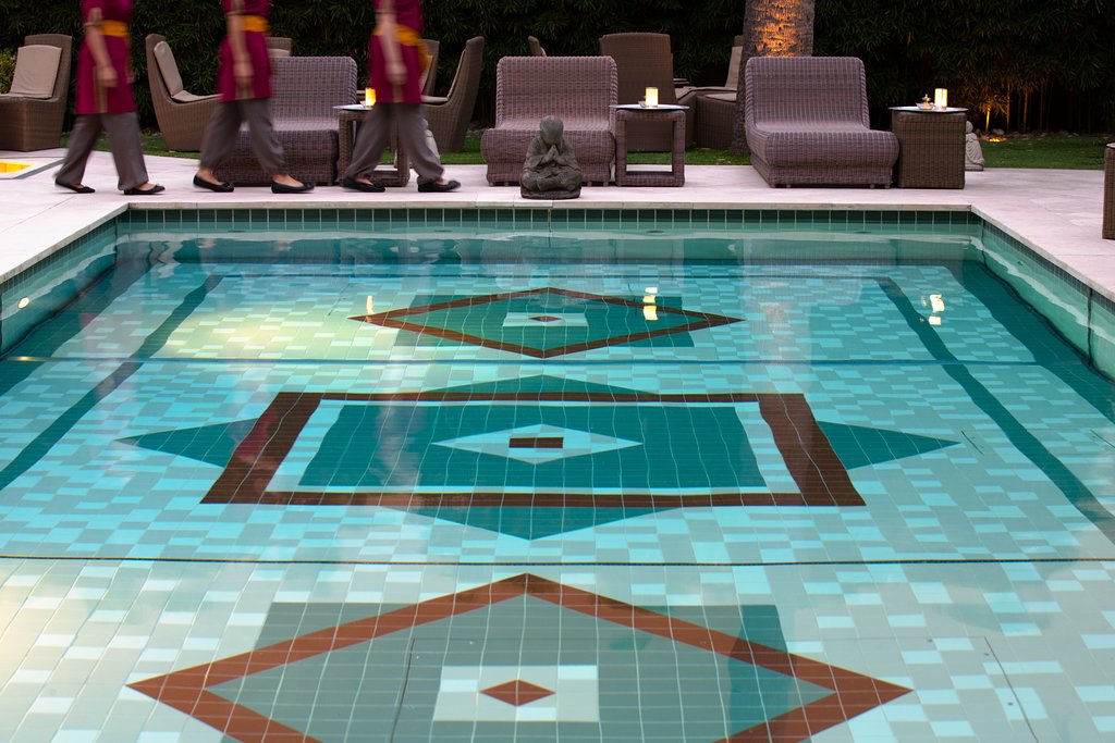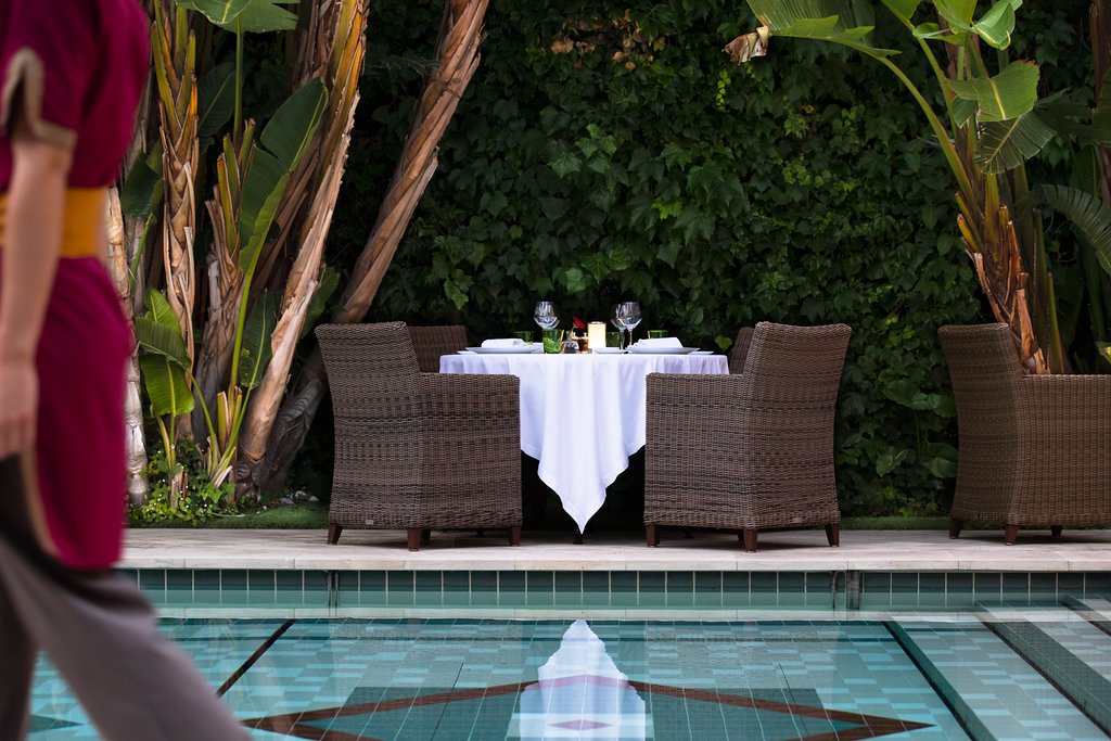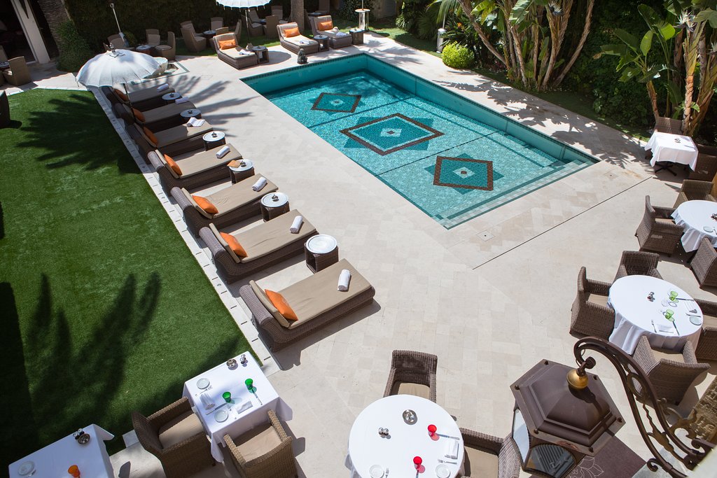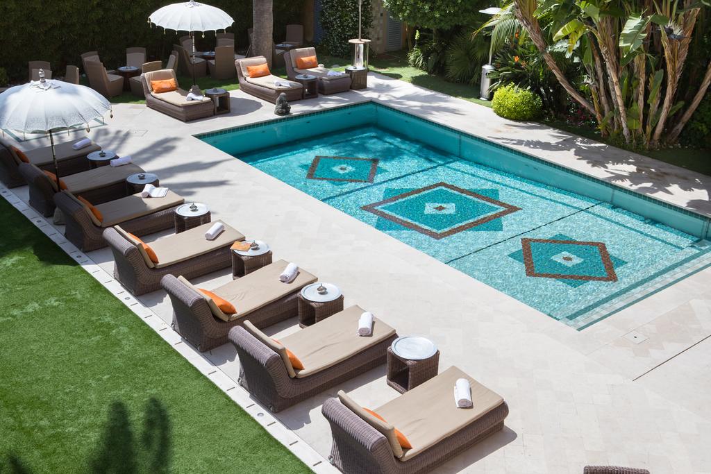 На территории отеля находится открытый бассейн, выложенный мозаикой и окруженный террасой для отдыха с шезлонгами и диванами для дневного отдыха под пологом.