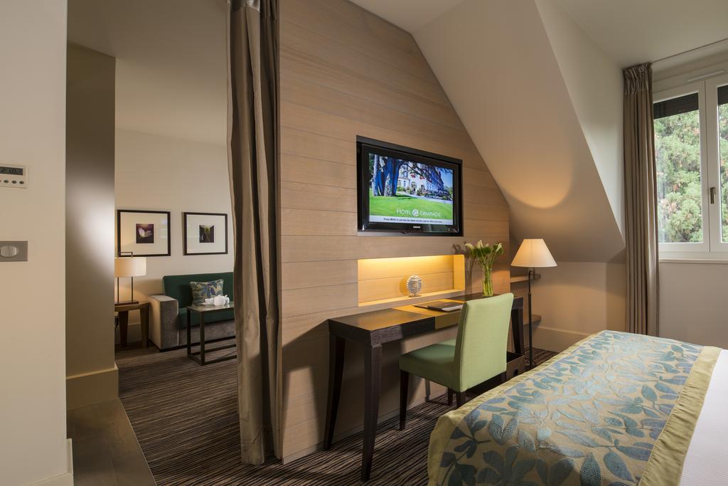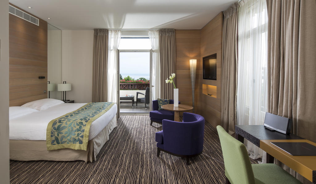 Castel Lake View Room: 35 м2. С видом на Женевское озеро. Состоит из спальни, зоны отдыха с раскладывающимся диваном, ванной комнаты с ванной и душем, балкона или лоджии. Максимальное размещение - 2 взрослых и 2 детей. Возможно соединение номеров.