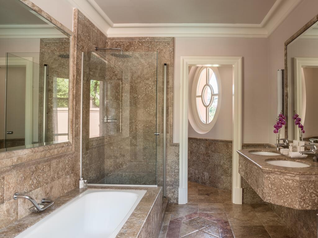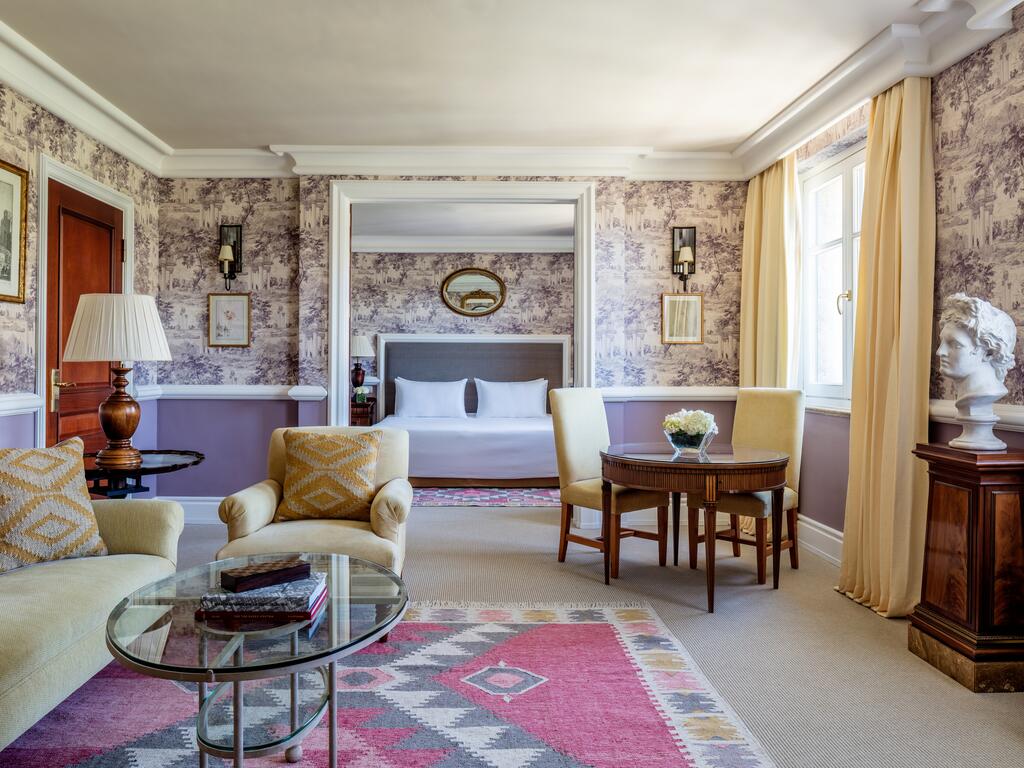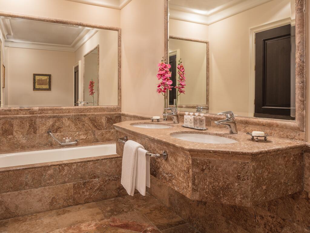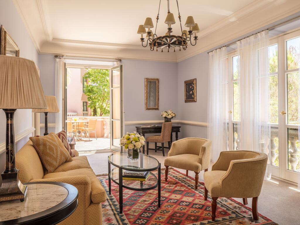 Junior Suite: 43-48 м2. Номера Junior Suite отличаются классической элегантностью с шикарной мебелью, полированным деревом, люстрами над головой и персидскими коврами под ногами. Спальня с мраморной ванной комнатой выходит в солнечную гостиную. Проводите спокойные дни с видом на ухоженные сады и возвышающиеся за ними горы.