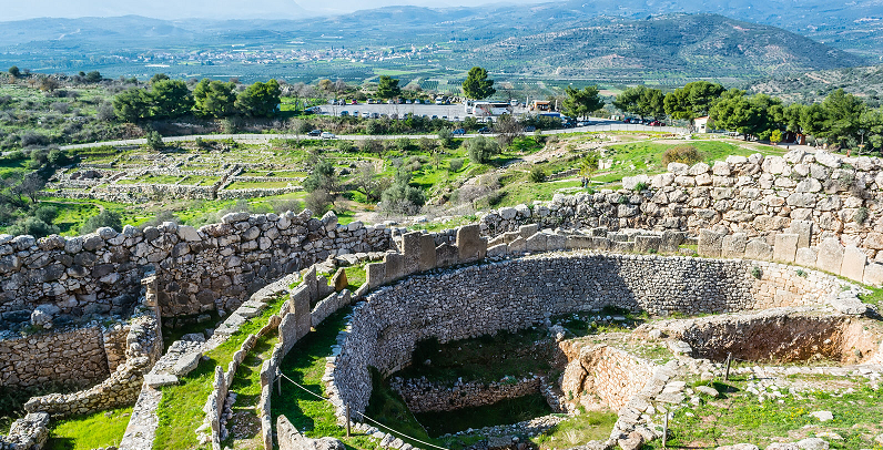 В центре микенского комплекса укреплённый холм — акрополь. Вокруг него немало гробниц, в том числе сокровищница Атрея —царя Микен и отца героев Троянской войны Минелая (муж Елены Прекрасной) и Агамемнона.