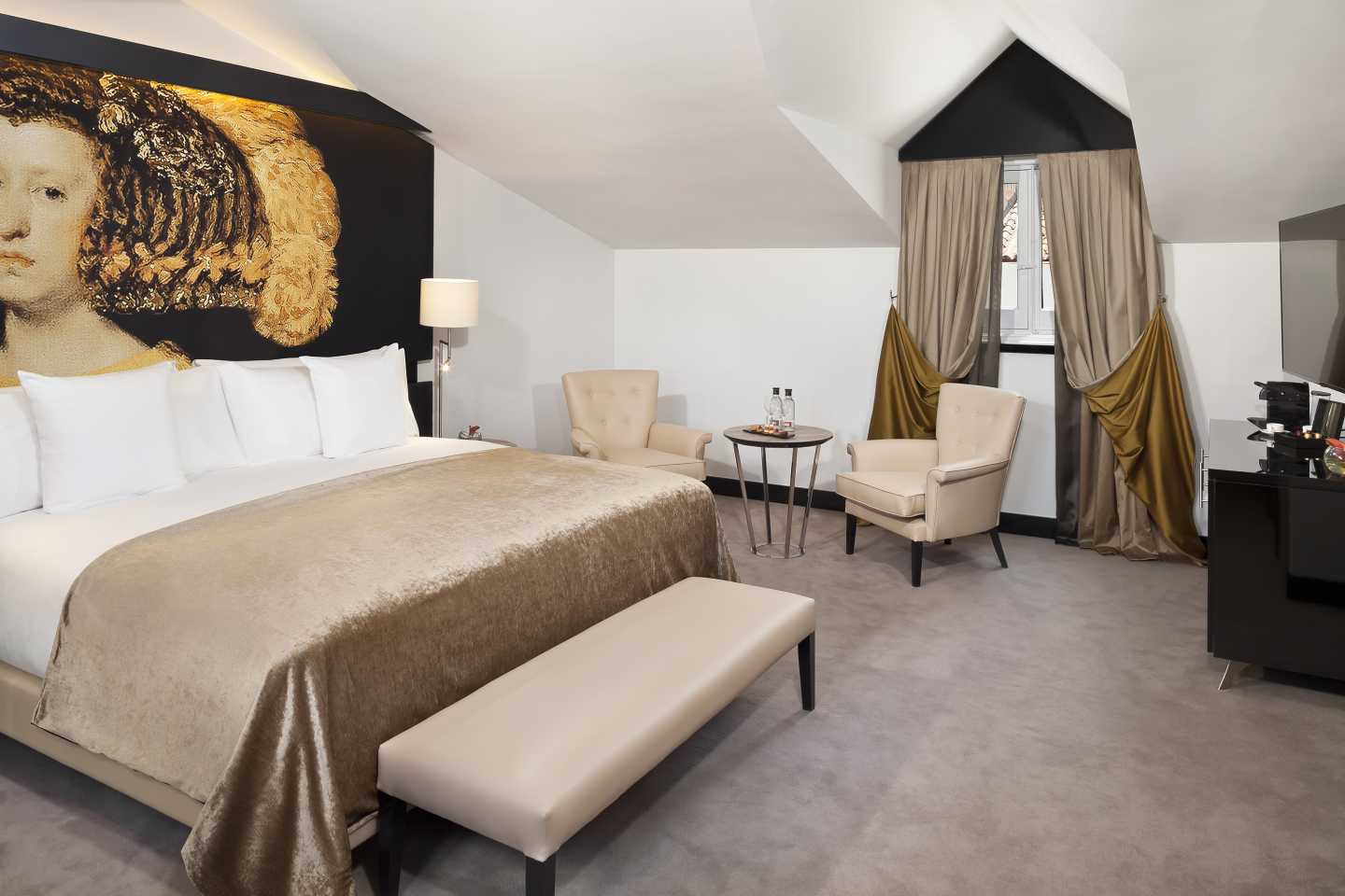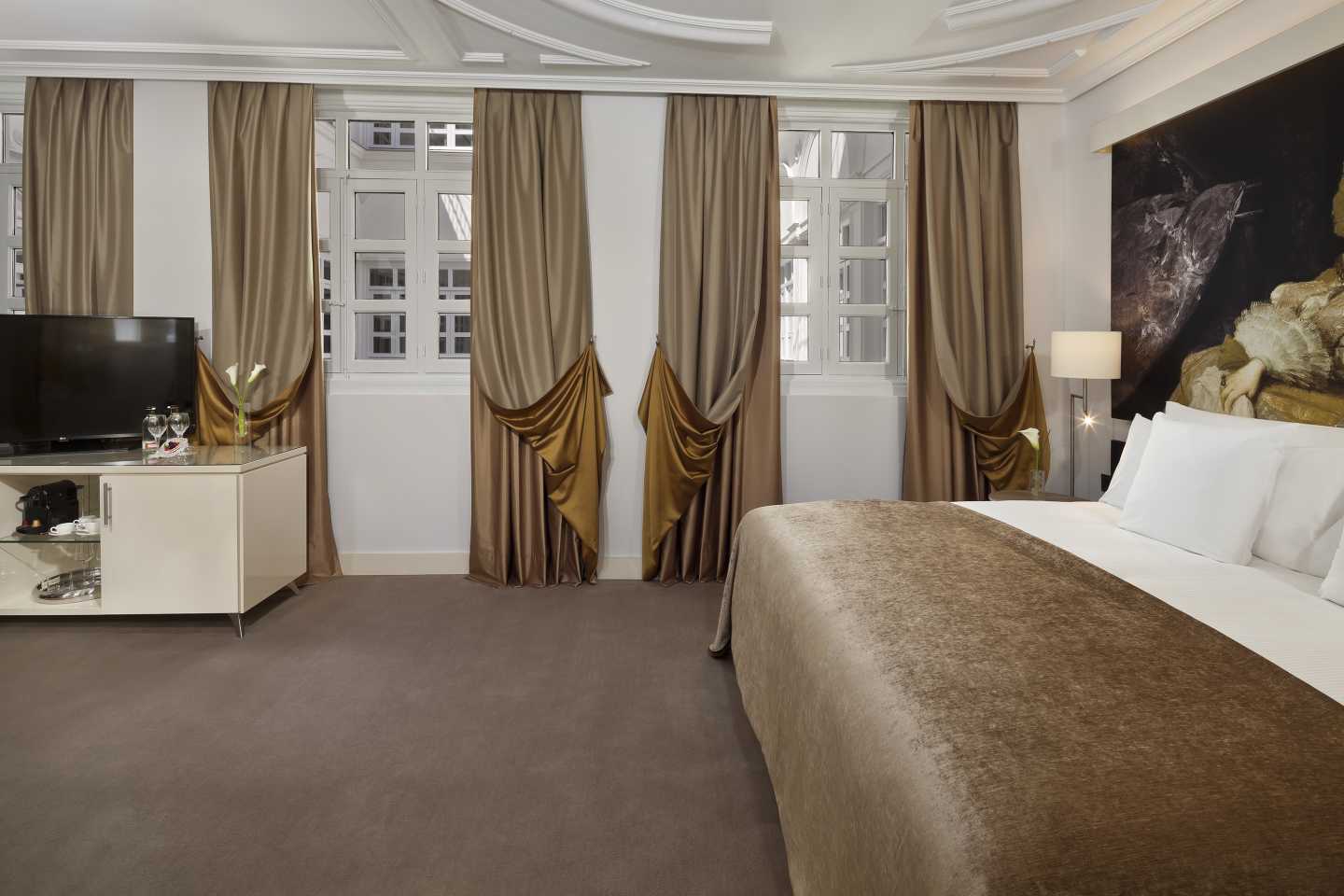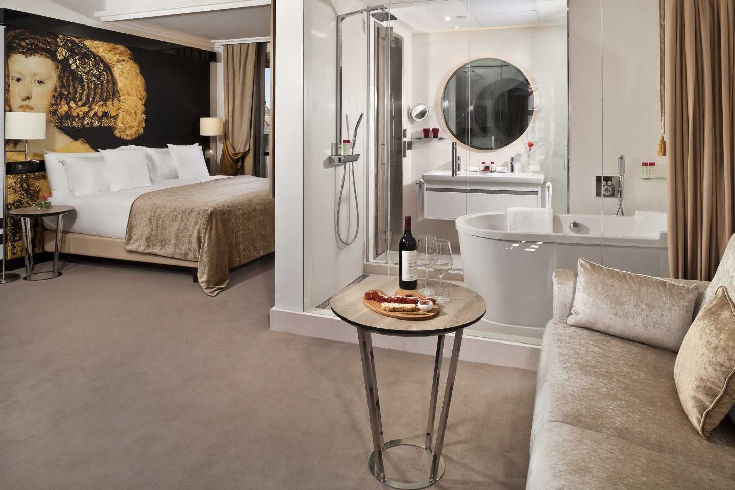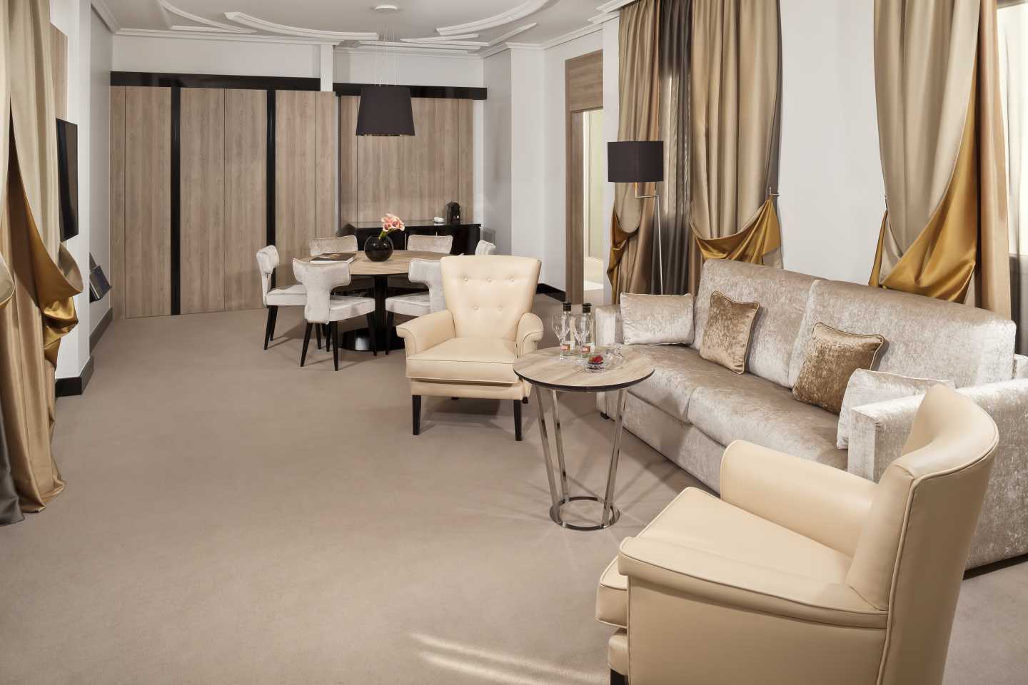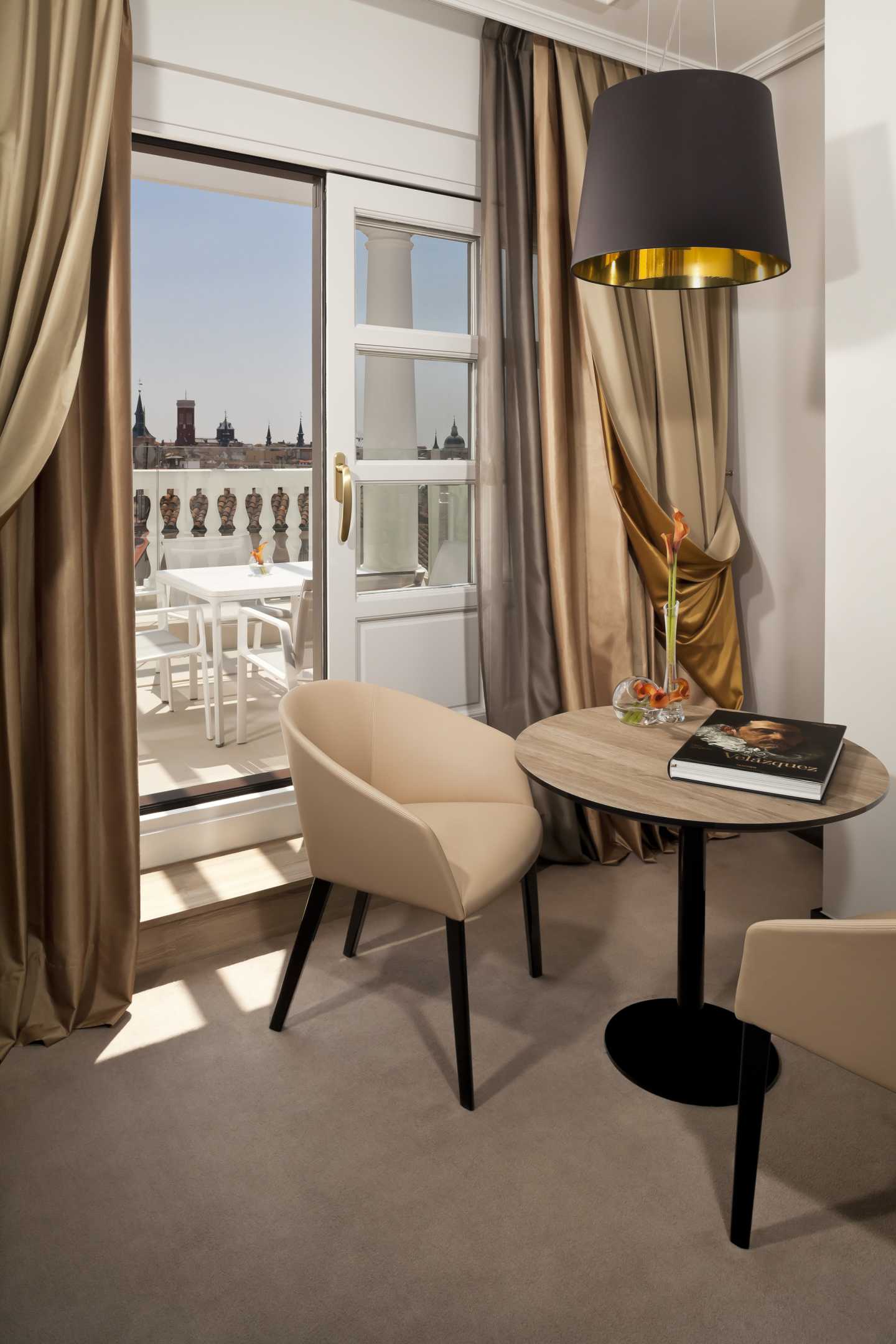 Presidential Penthouse Suite RedLevel: 130 м2. Роскошный номер состоит из спальни с кроватью king-size или двумя кроватями twin, гостиной, столовой или переговорной комнаты с отдельным входом и ванной комнатой, гардеробной, ванной комнаты с ванной и отдельным ливневым душем, большой террасы с зоной отдыха, обеденной зоной и панорамным видом на Королевский театр, квартал Габсбургов и город. Гостям номера предоставляются дополнительные услуги и доступ в лаундж RedLevel.
