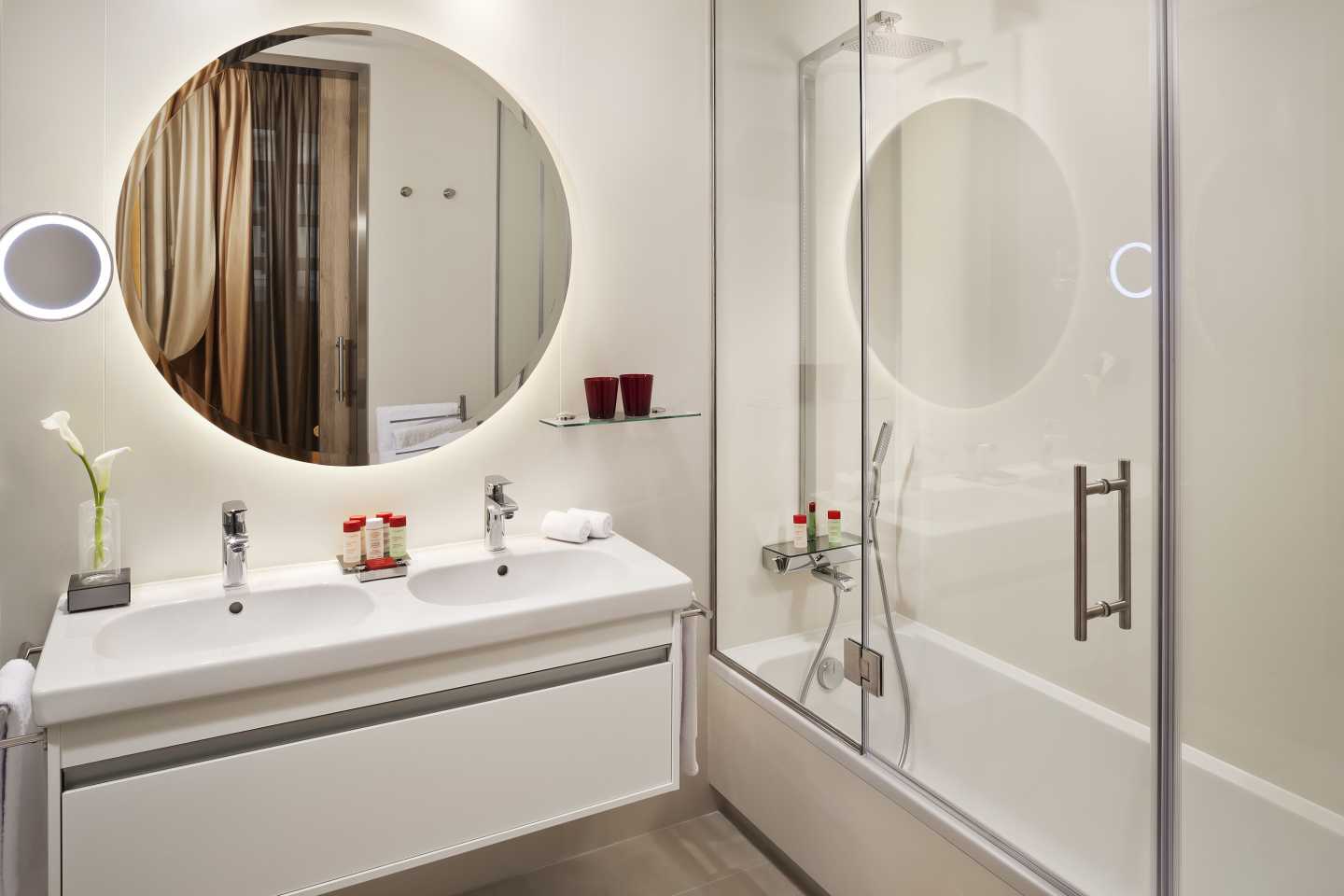 Junior Suite RedLevel: 45 м2. Состоит из спальни с кроватью king-size или двумя односпальными кроватями и зоной отдыха, гардеробной, ванной комнаты с ванной и отдельным ливневым душем. Вид на город. Гостям номера предоставляются дополнительные услуги и доступ в лаундж RedLevel.